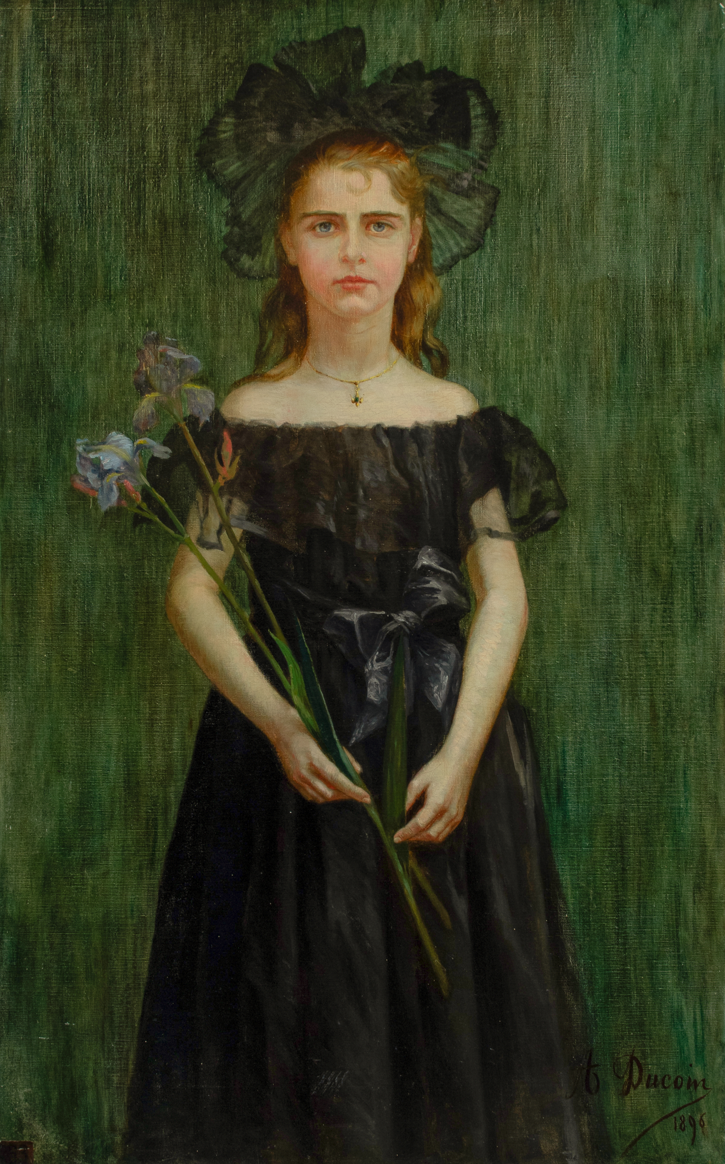 Portrait of a girl, three-quarter length, wearing a black dress and holding lilies