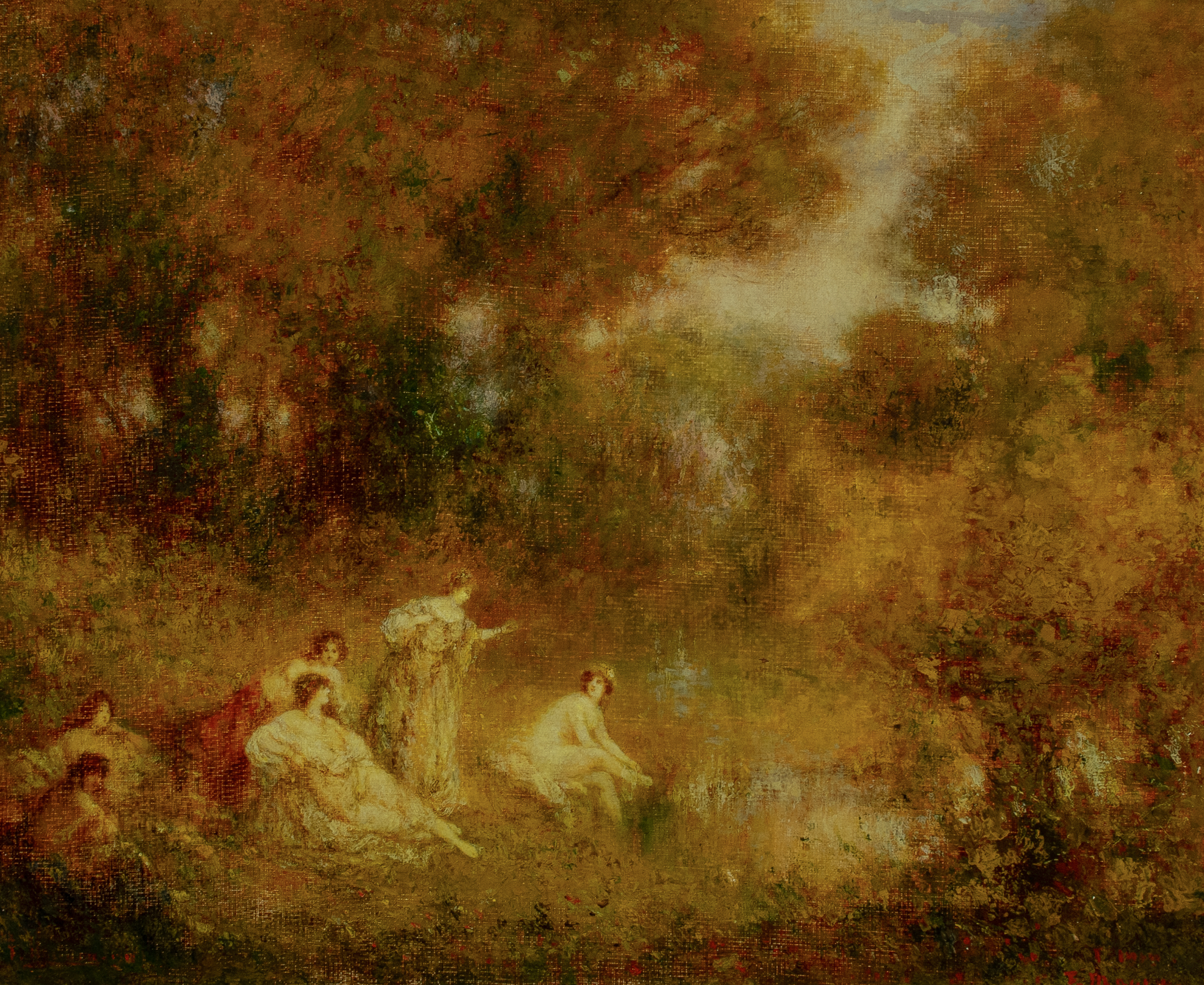 Female nudes bathing in a landscape
