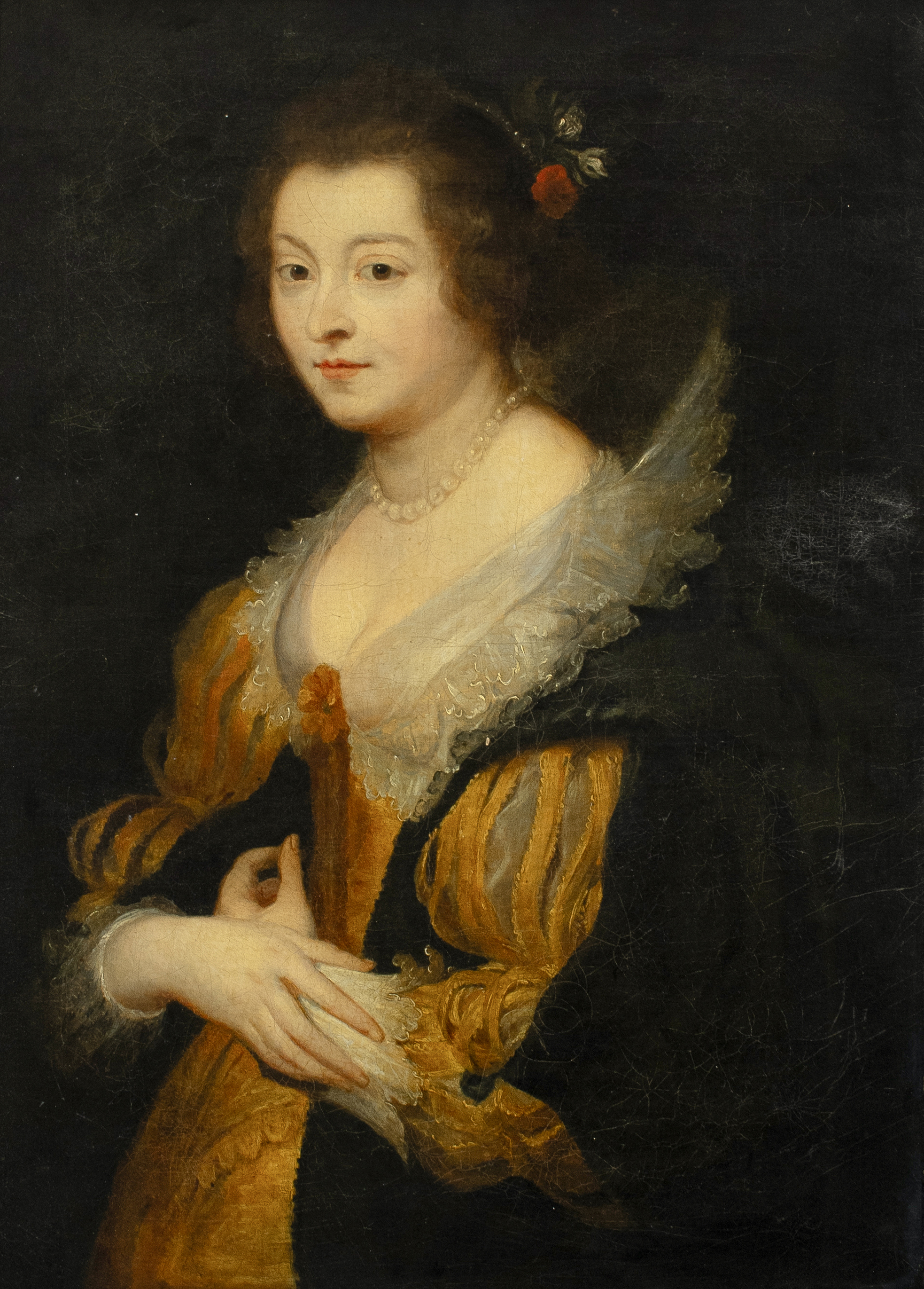 Portrait of a lady, half-length, wearing a gold-coloured dress and pearl necklace