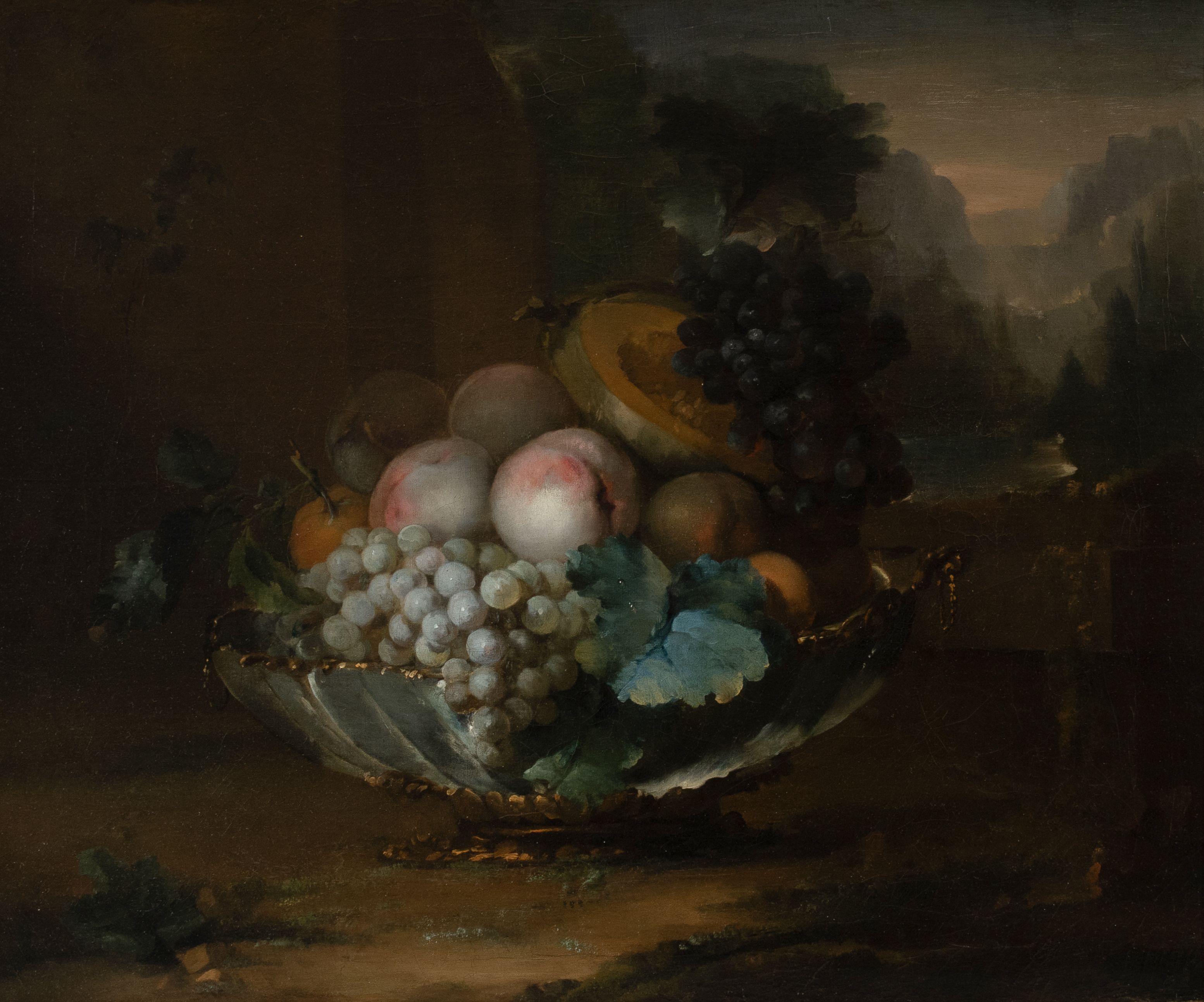 Still life with fruit in an ormolu mounted glass dish, a park landscape beyond