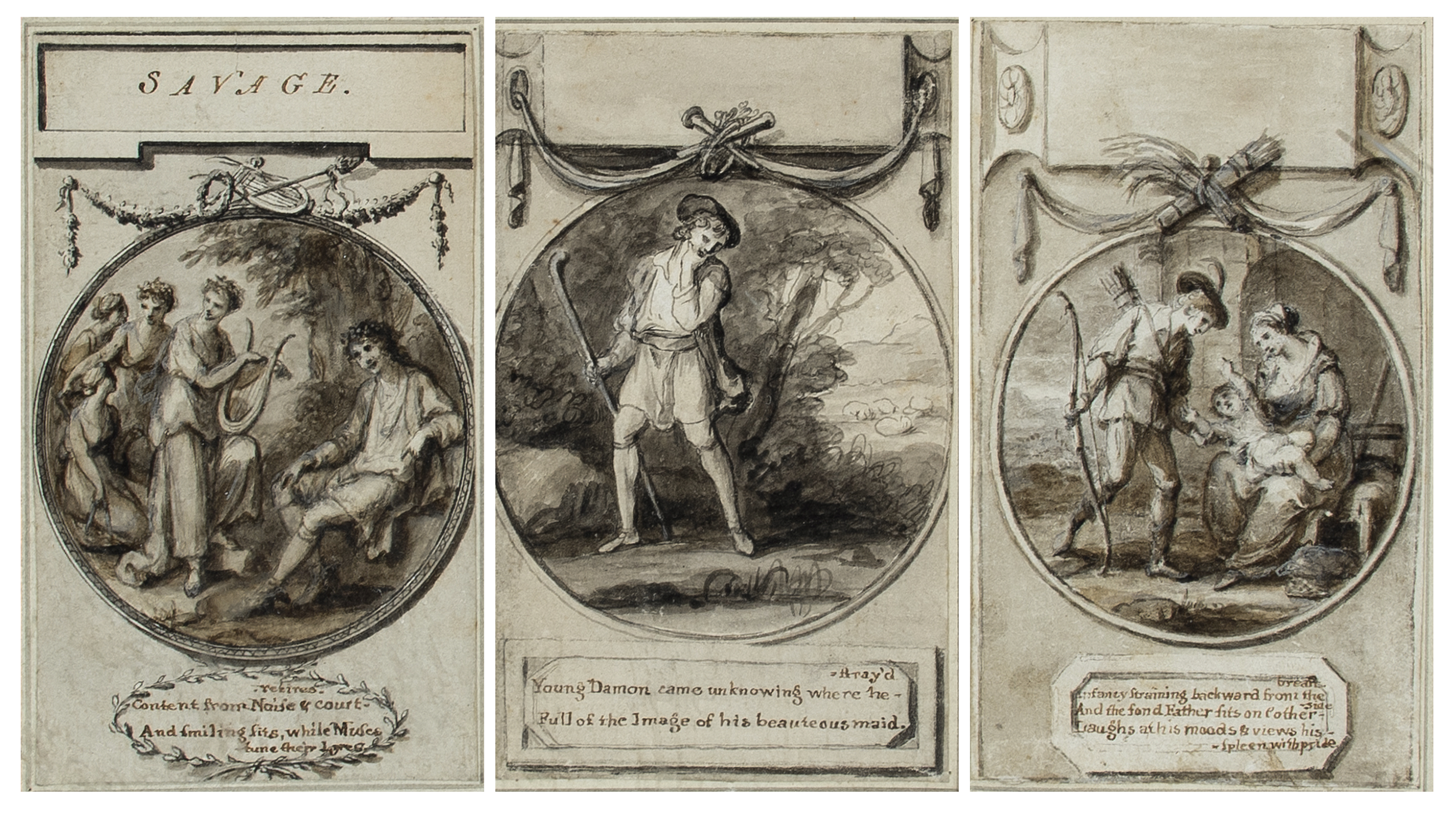 Three, inscribed respectively SAVAGE./Content from Noise & court/retires/And smilinsits while Muses/tune their Lyres; Young Damon came unknowing where he-/stray'd/Full of the Image of his beauteous maid; and Infancy Straining backward from the breasts./And the fond Father sits on t'other/-side/Laughs at his moods & views his-/-Spleen with pride (each within a cartouche)