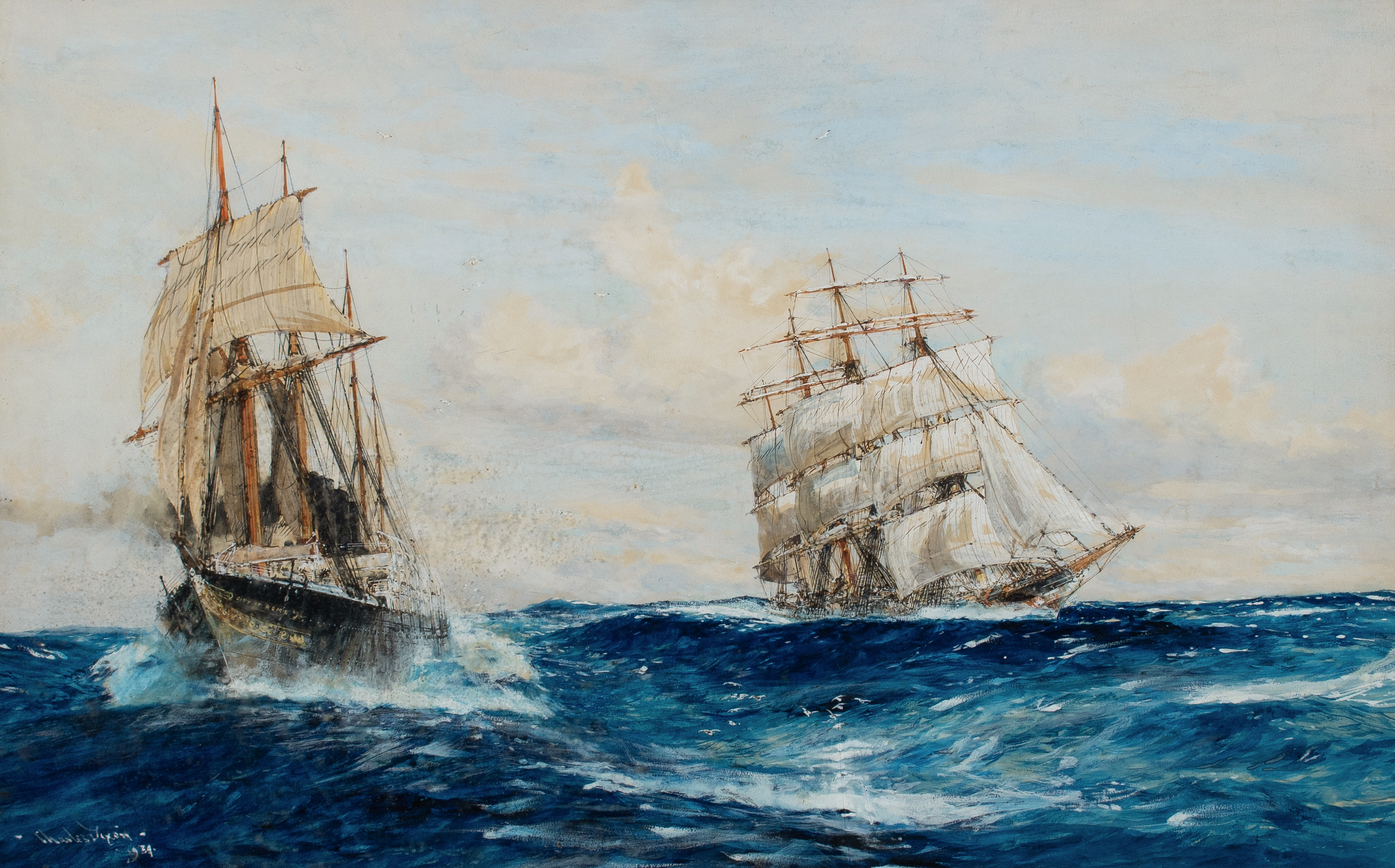 The famous City of Rome overhauling a big four-masted windjammer in an Atlantic swell
