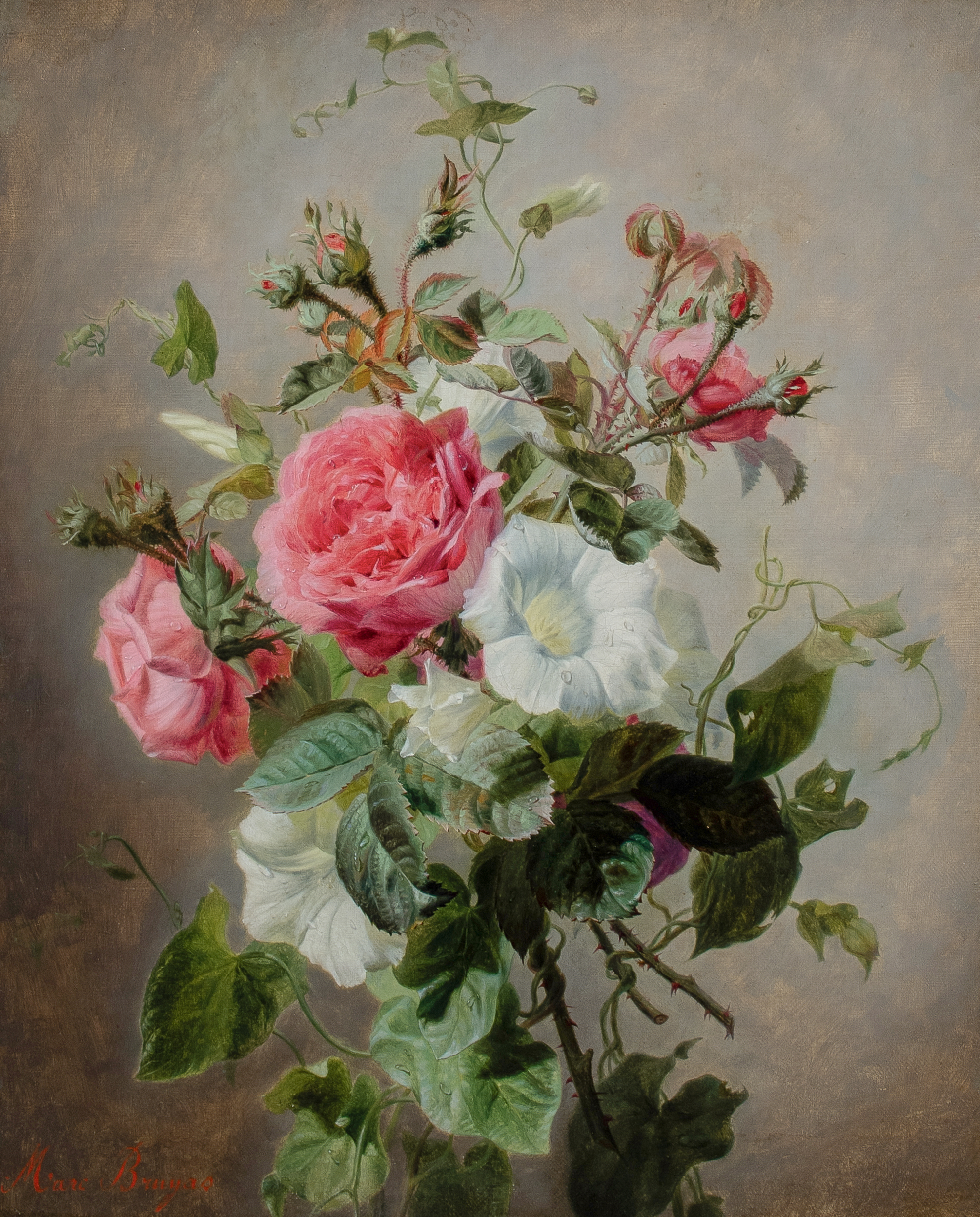 Still life with pink roses and white convolvulus