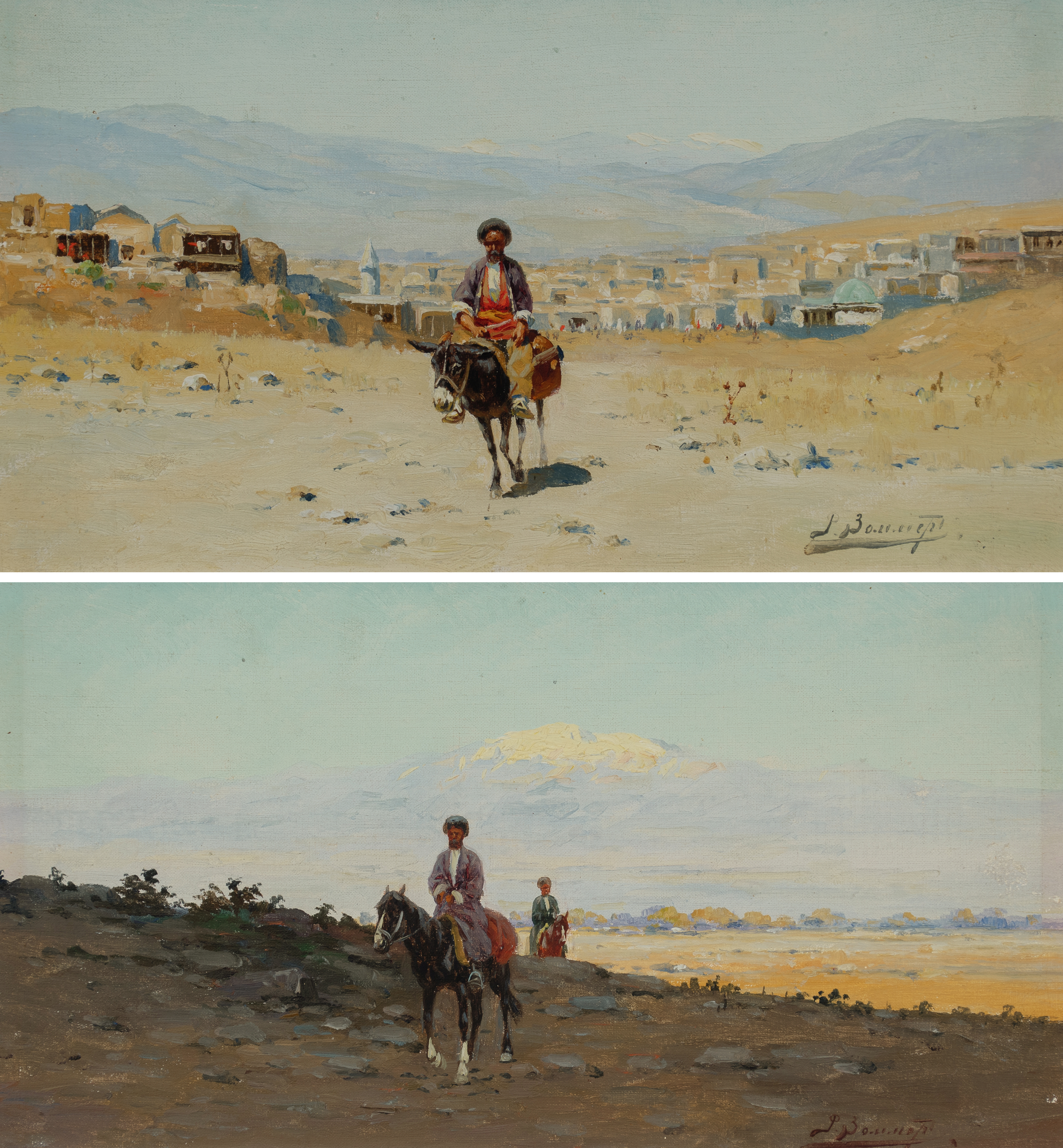 A figure on a donkey on the outskirts of an Oriental town; Mountainous landscape with two figures on horseback