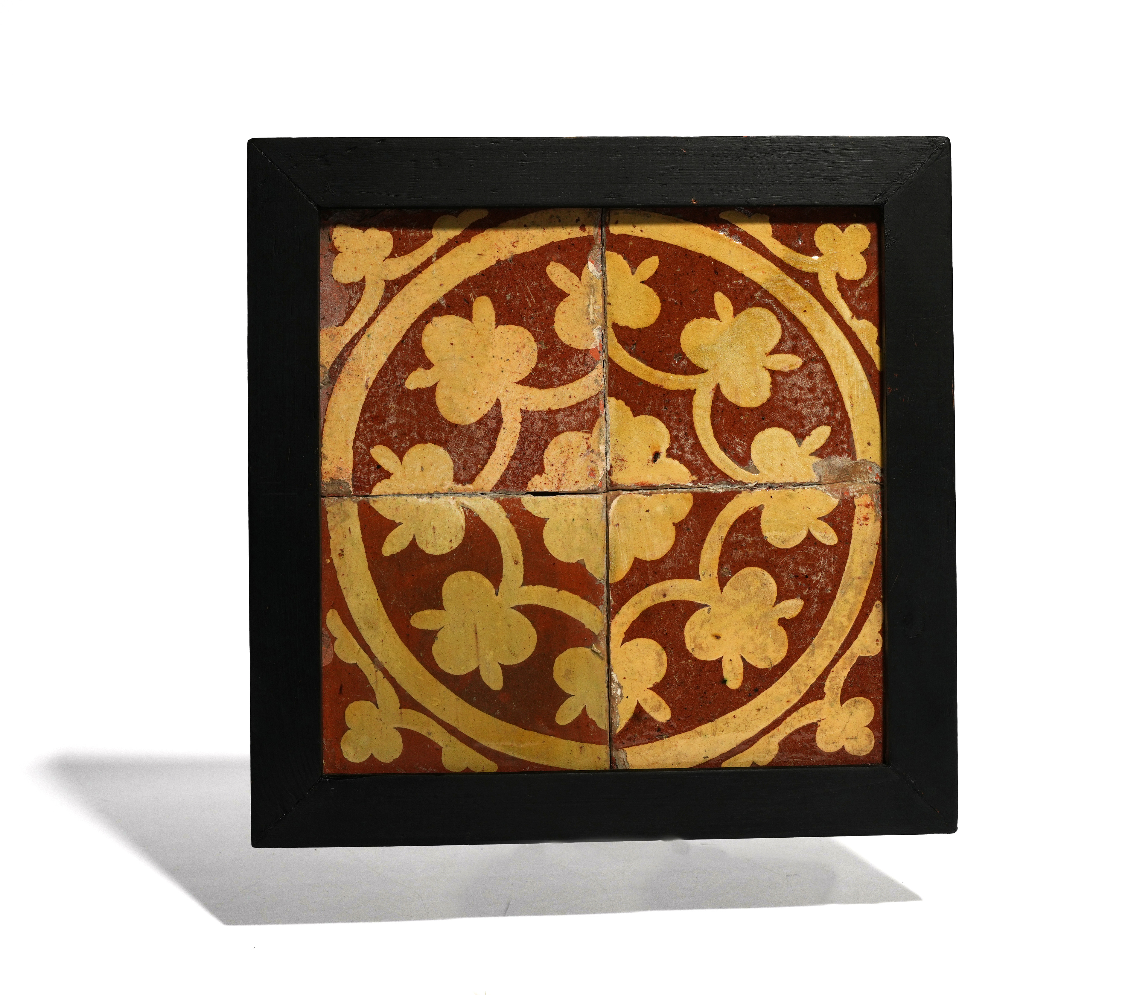 A panel of four medieval encaustic tiles, 15th century, decorated in cream slip to form a circular