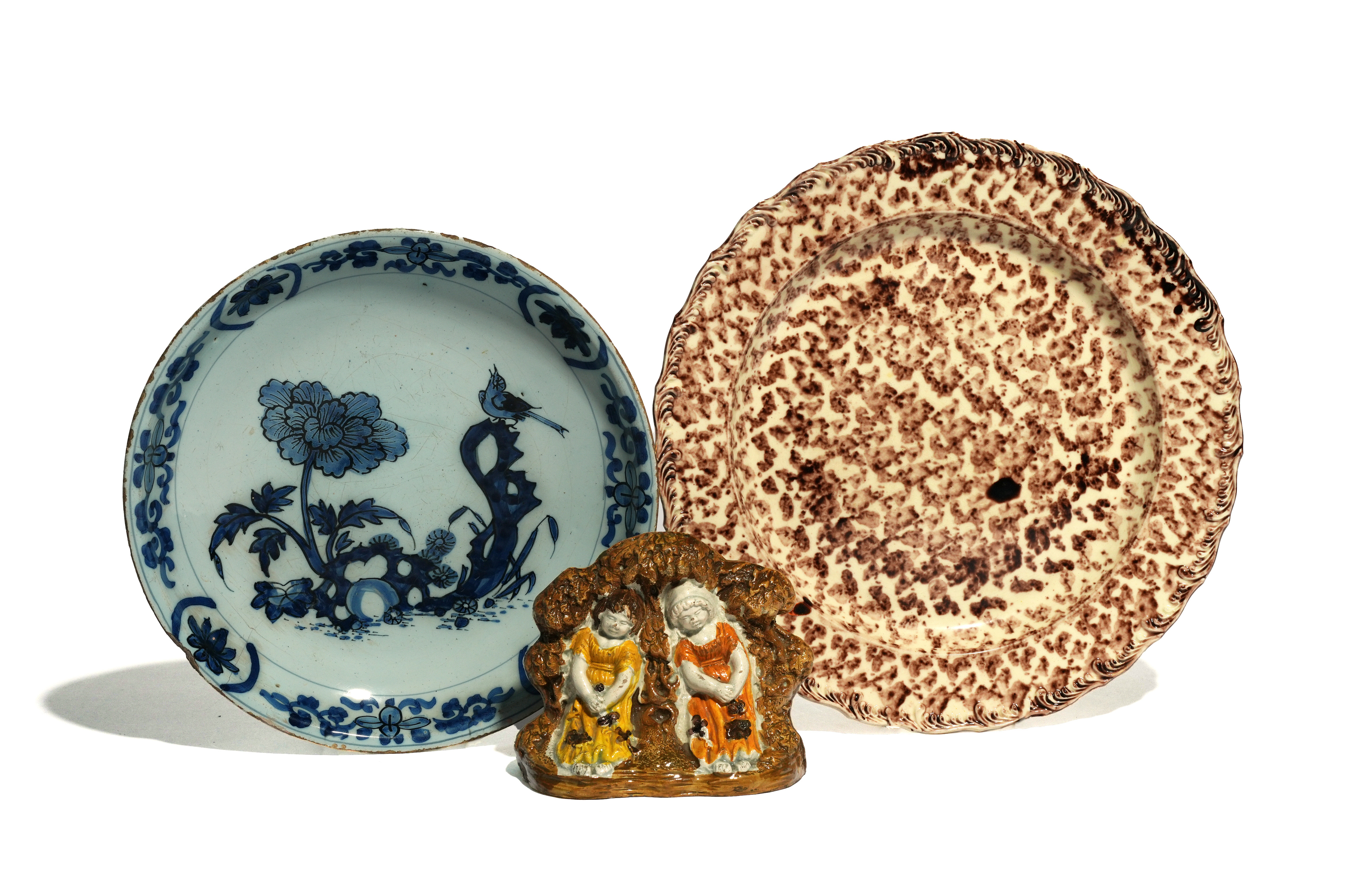 A Whieldon plate and a shallow Delft bowl, 2nd half 18th century, the plate sponged in manganese, the bowl painted in blue with a bird atop rockwork, and a Pratt ware figure group of the Babes in the Wood, 25cm max. (3)