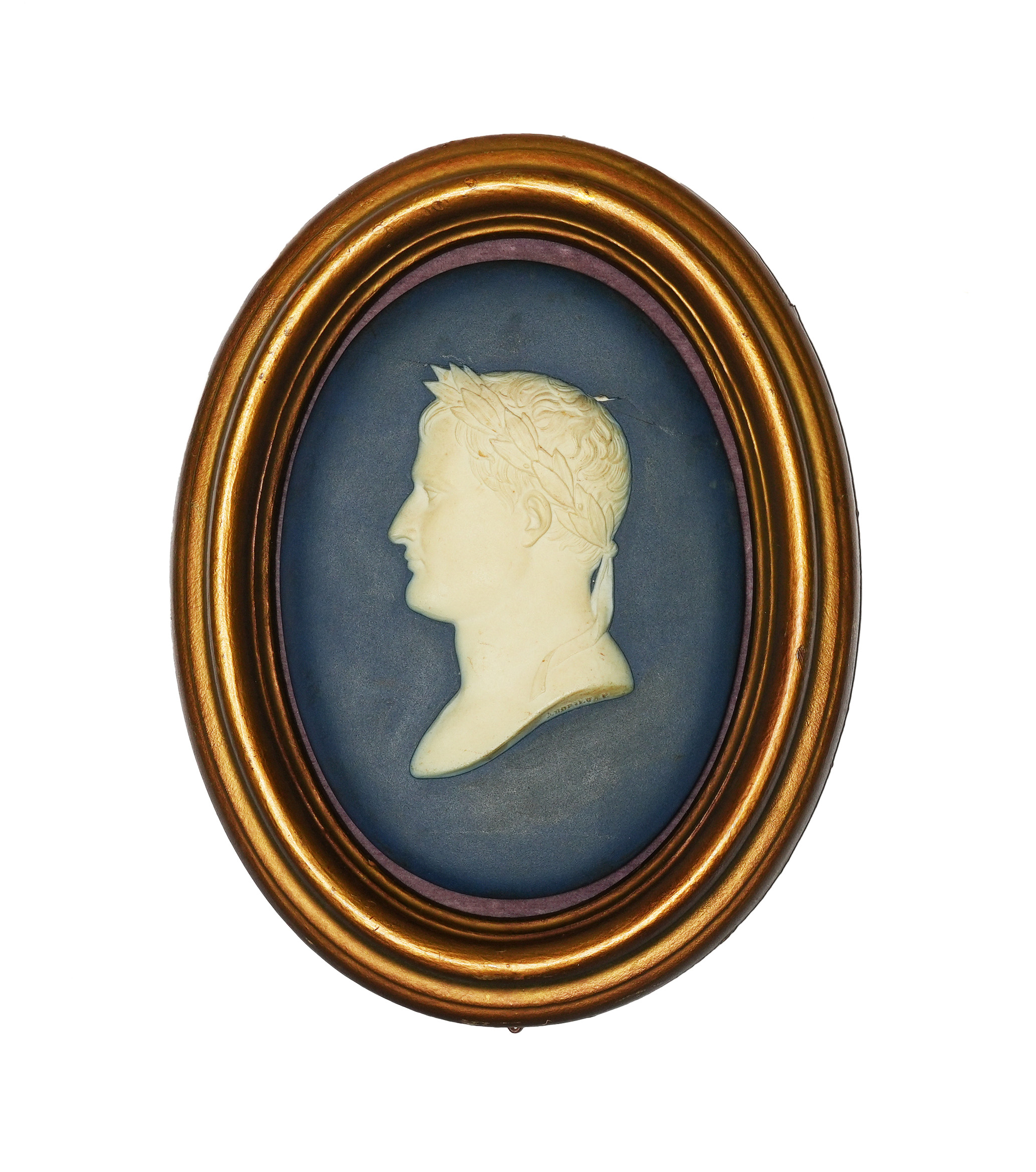 A Wedgwood Jasper ware portrait plaque of Napoleon, 1st half 19th century, after Bertrand Andrieu for Sèvres, modelled in relief in white on a dark blue ground, the bust inscribed 'Andrieu', impressed Wedgwood mark to the reverse, broken and restuck, the plaque 15.7cm.