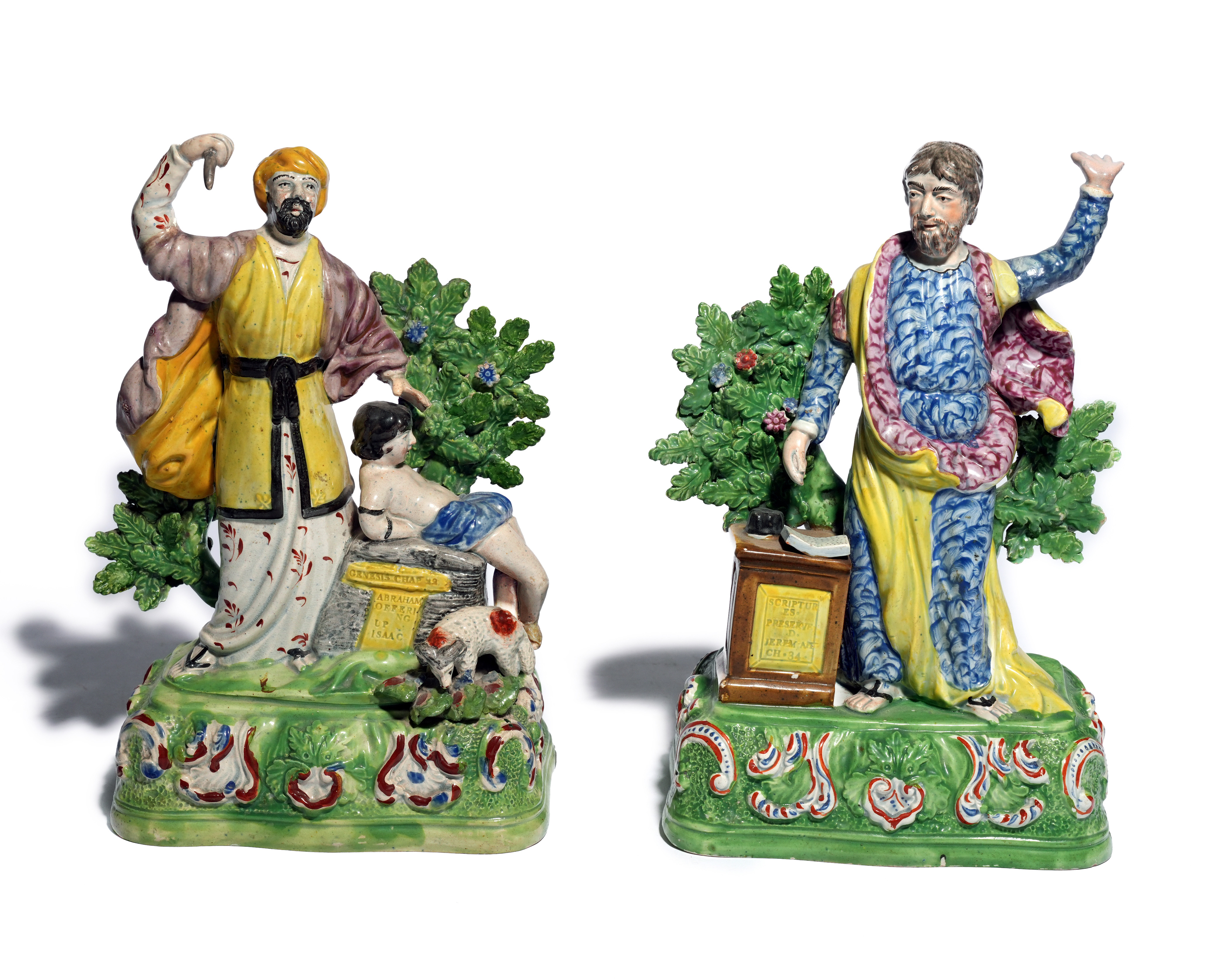 A matched pair of Staffordshire figures of religious subjects, c.1815-20, one of Jeremiah reading scripture and raising his left hand, the other of Abraham sacrificing Isaac, both standing before flowering bocage and raised on tall bases picked out in blue and red, some restorations, 27cm. (2)