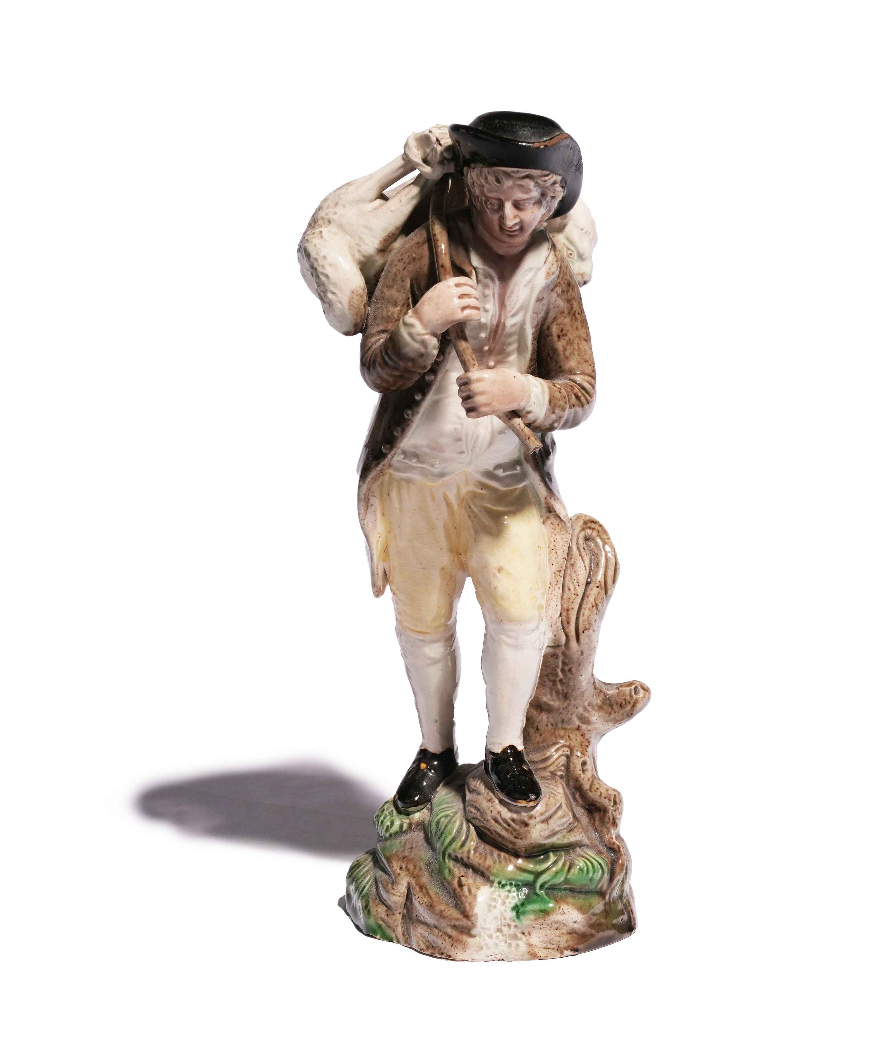 A Ralph Wood figure of 'The Lost Sheep', c.1790, a young shepherd carrying a lamb over his
