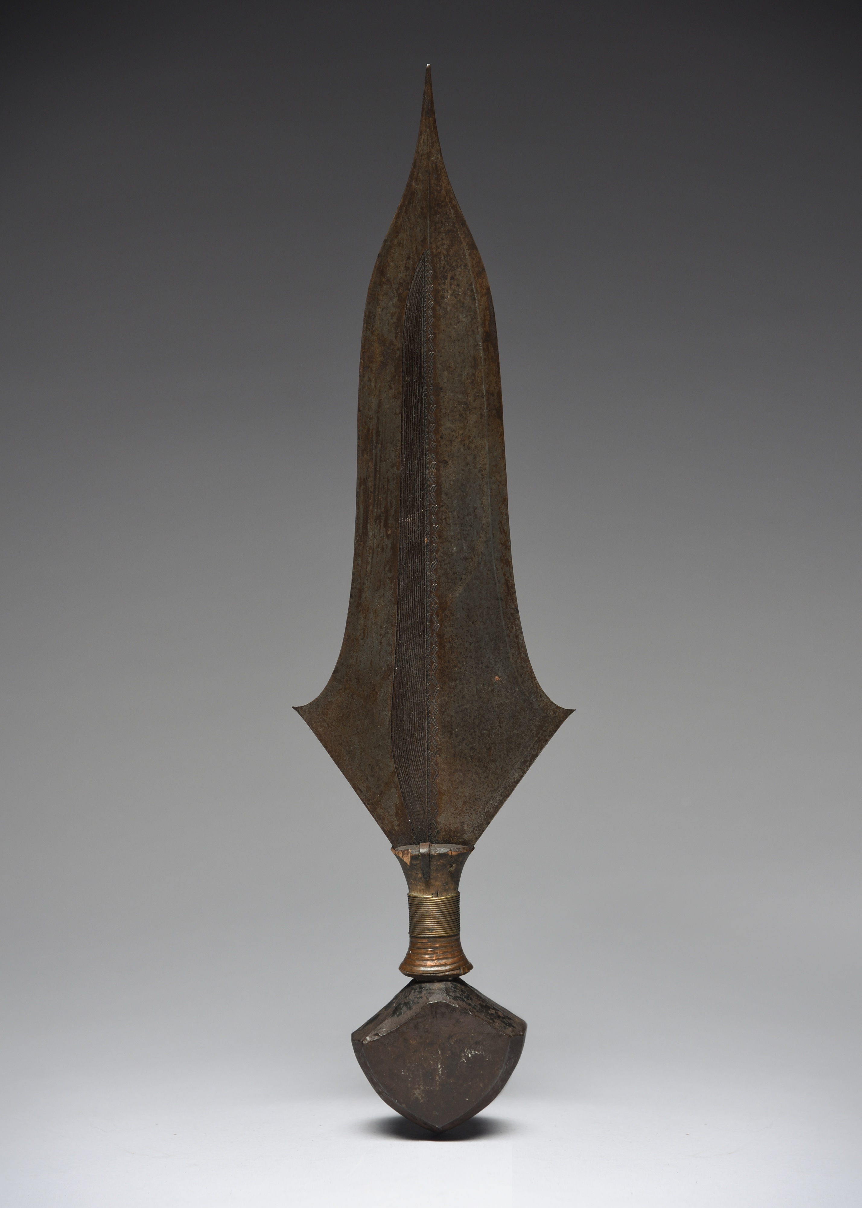 the steel blade with fine incised linear decoration, the wood handle with copper and brass wire binding and a heavy iron pommel,