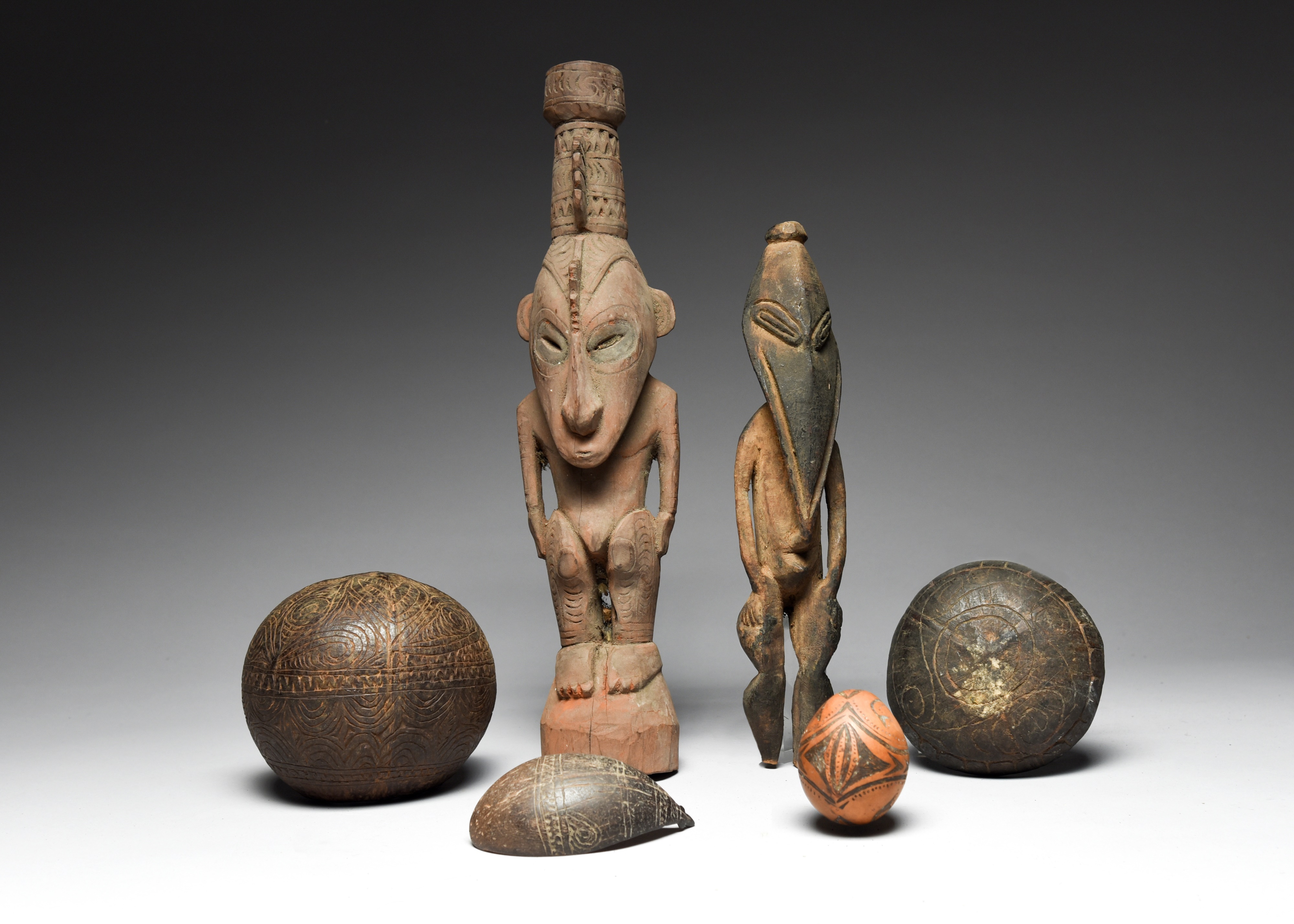 a Ramu River standing figure, with a long pointed face, 32.2cm high, two Papua New Guinea carved coconut shell bowls, 14.5cm and 12.5cm wide, a similar Papua New Guinea spoon, 12cm long and a Papua New Guinea decorated gourd, 7cm long. (6)