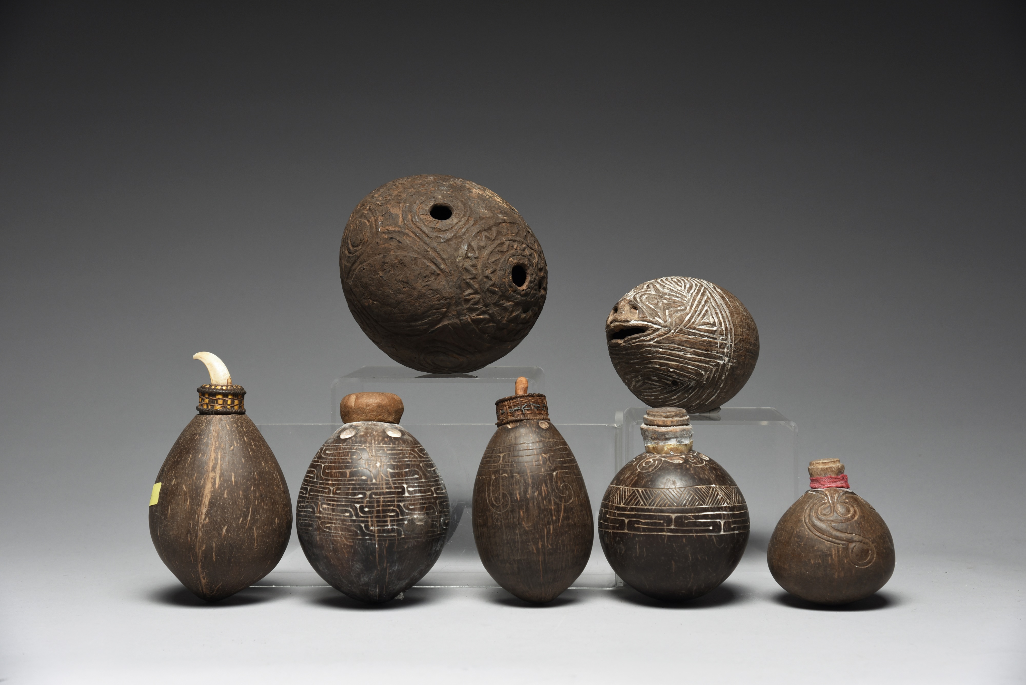 coconut shell, four with incised decoration and all with stoppers, two with tusks,