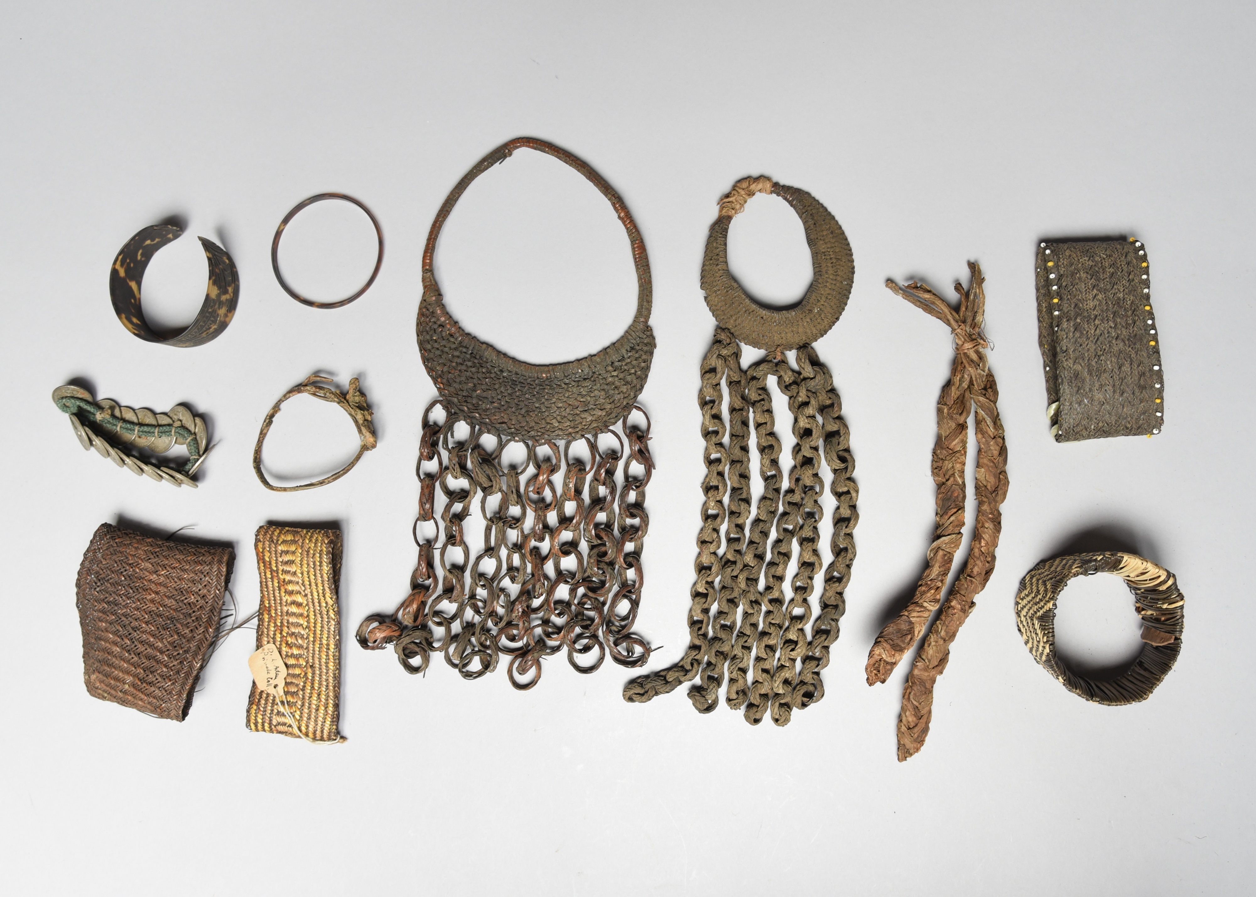 two Papua New Guinea turtleshell bracelets, a Papua New Guinea coin bracelet with 1930s/40s one shillings, a Kukukuku pig's penis bracelet, two Papau New Guinea tobacco plaits and two Papua New Guinea fibre chest ornaments. (12)
