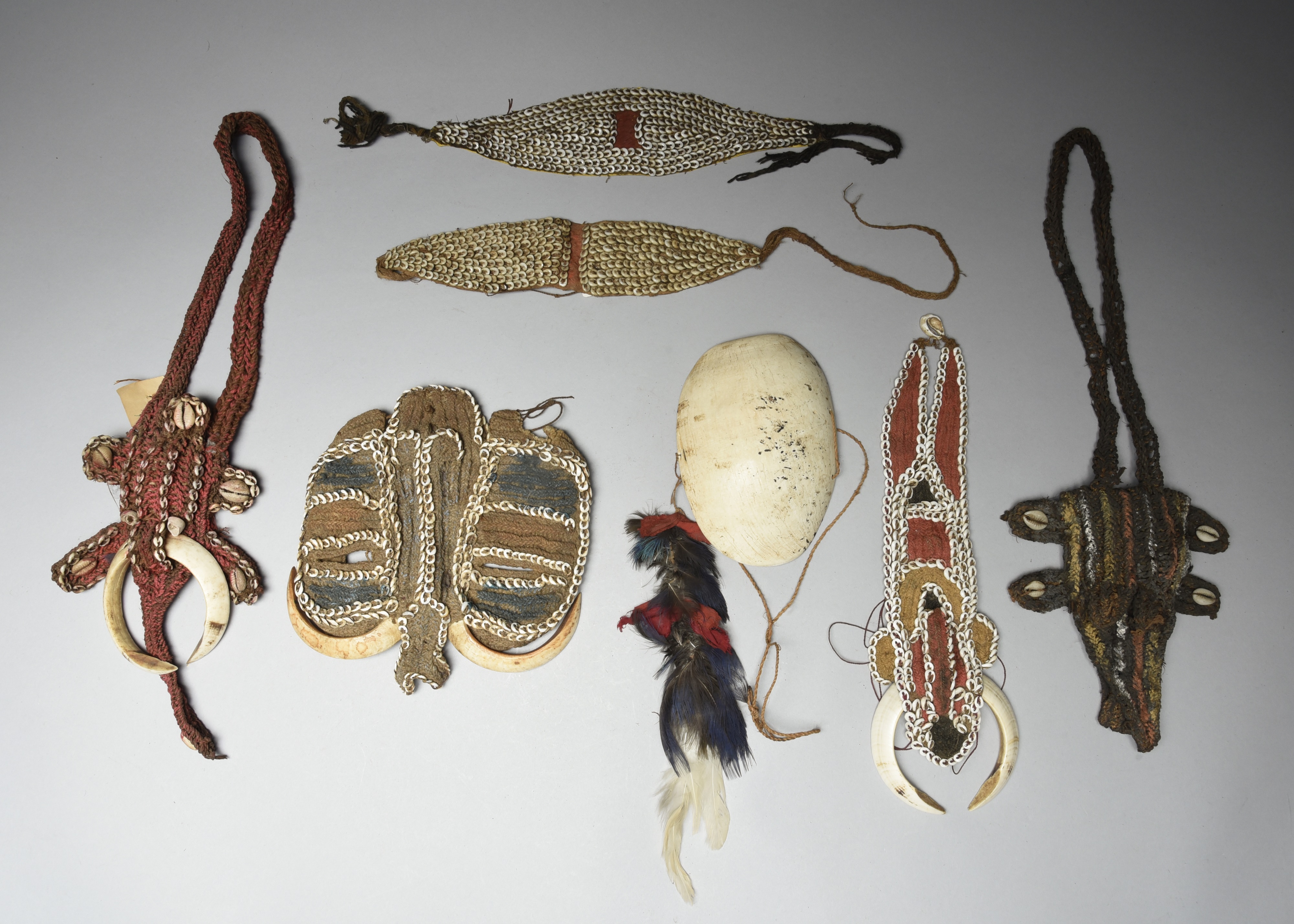 woven fibre, cowrie and nassa shells, with pigment and two with boar's tusks,