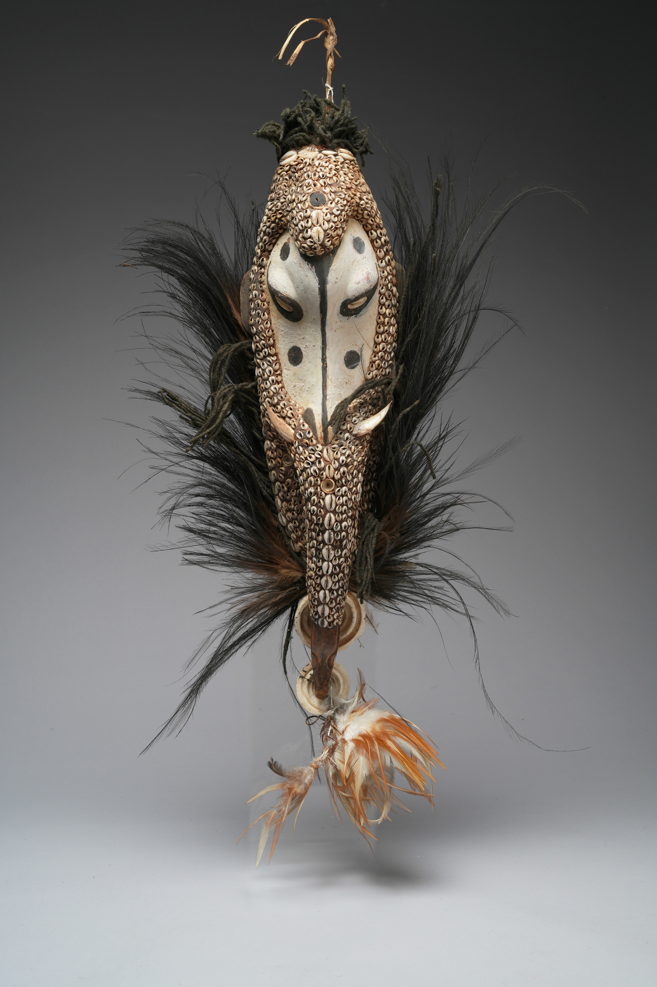 wood, clay, shells, cassowary feathers, fibre, the curved face with inset eyes, a long tongue under the longer scroll nose with a crocodile head terminal,