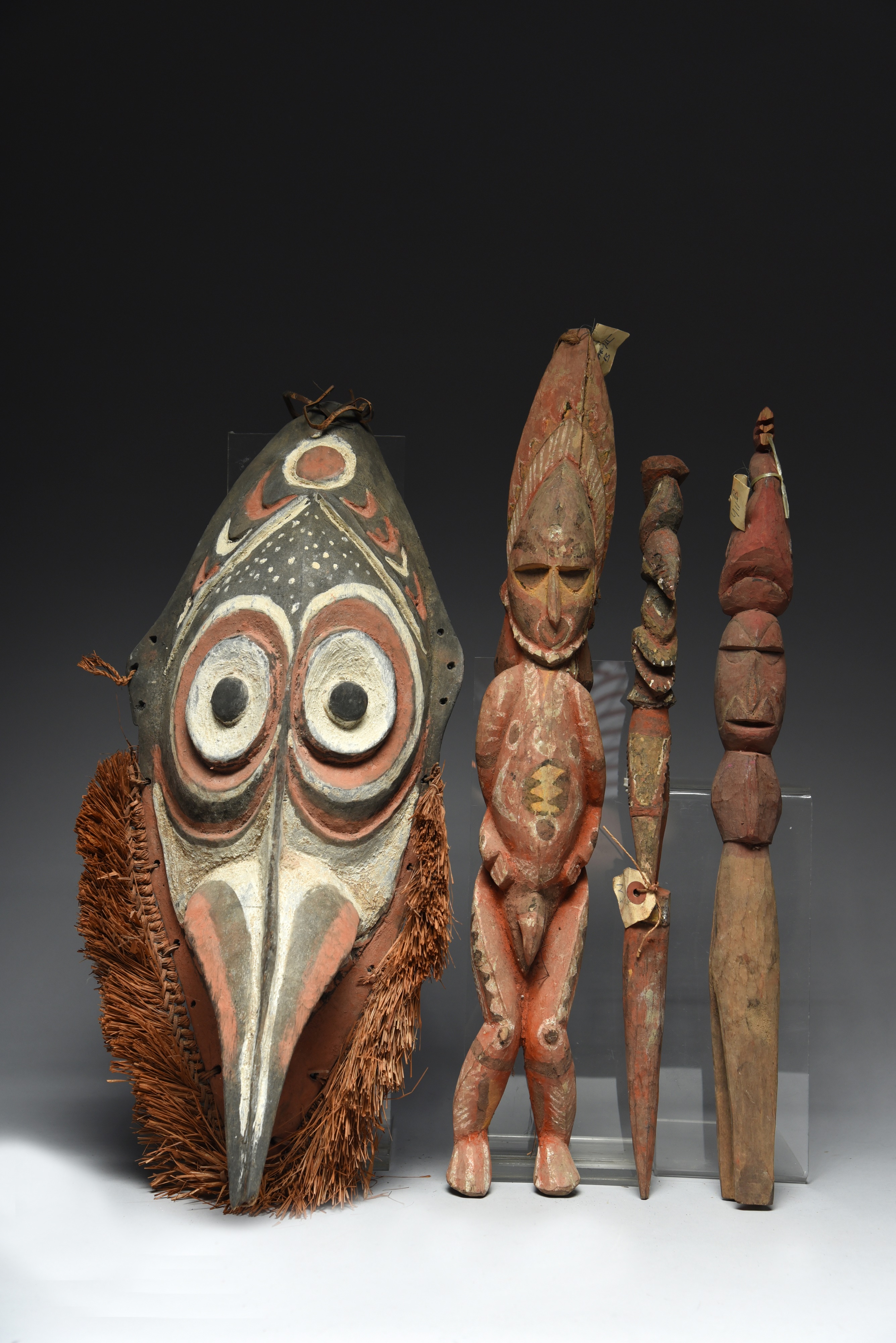 an Abelam ancestor figure, with pigment decoration, 57cm high, and two Abelam markers, carved a head and a bird, with pigment, 48cm and 52cm high. (4)
