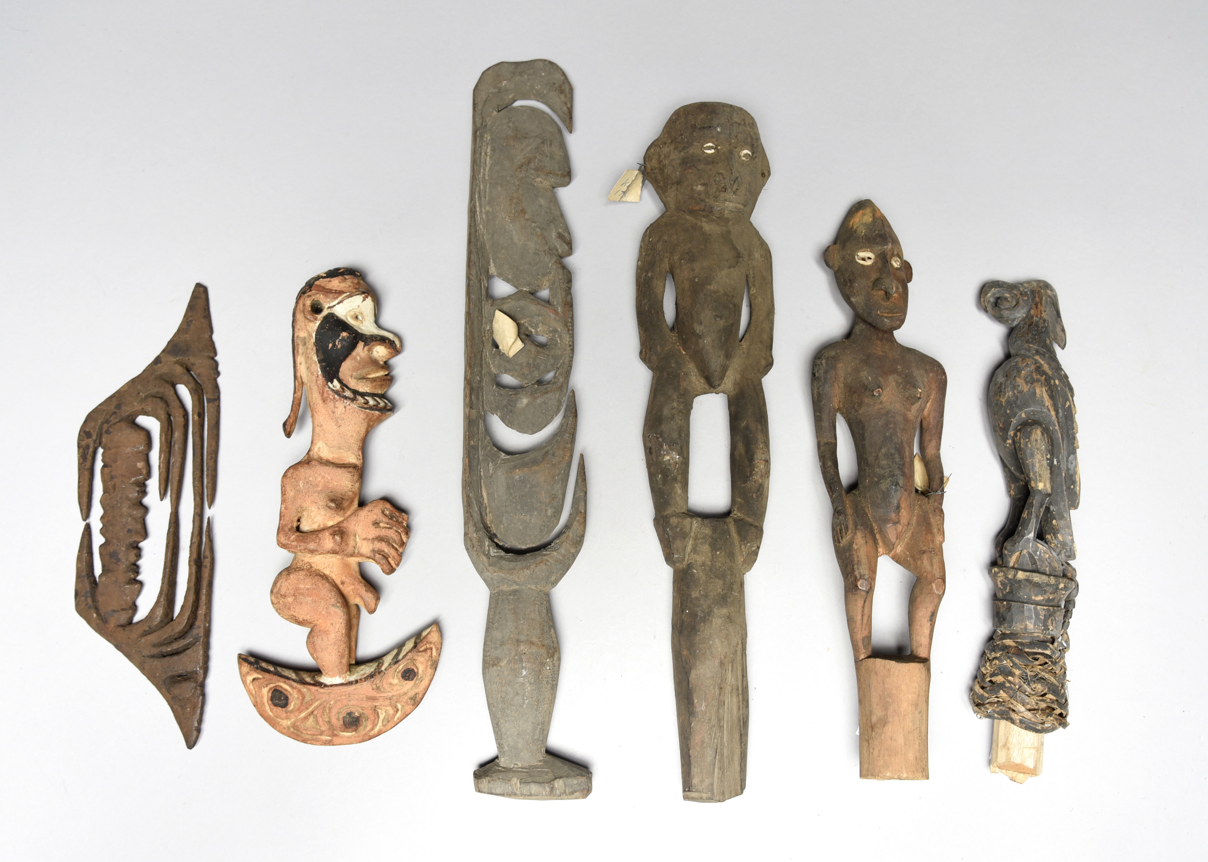 and five Papua New Guinea carvings, including a hook figure, a male figure, a bird and two hunting charms. (6)