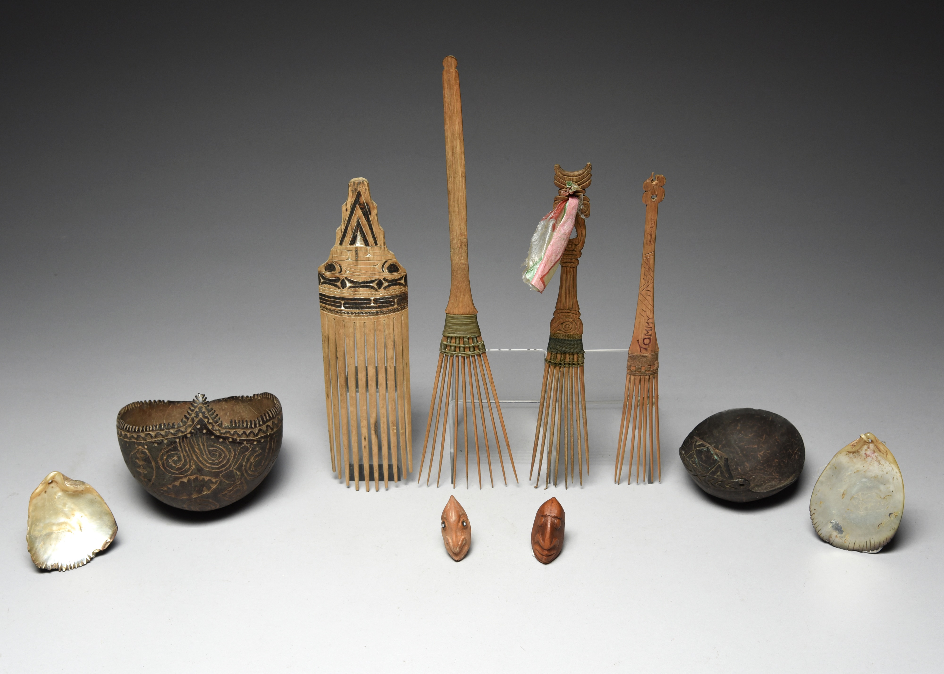 two Papua New Guinea coconut shell spoons/scoops, and four combs. (8)