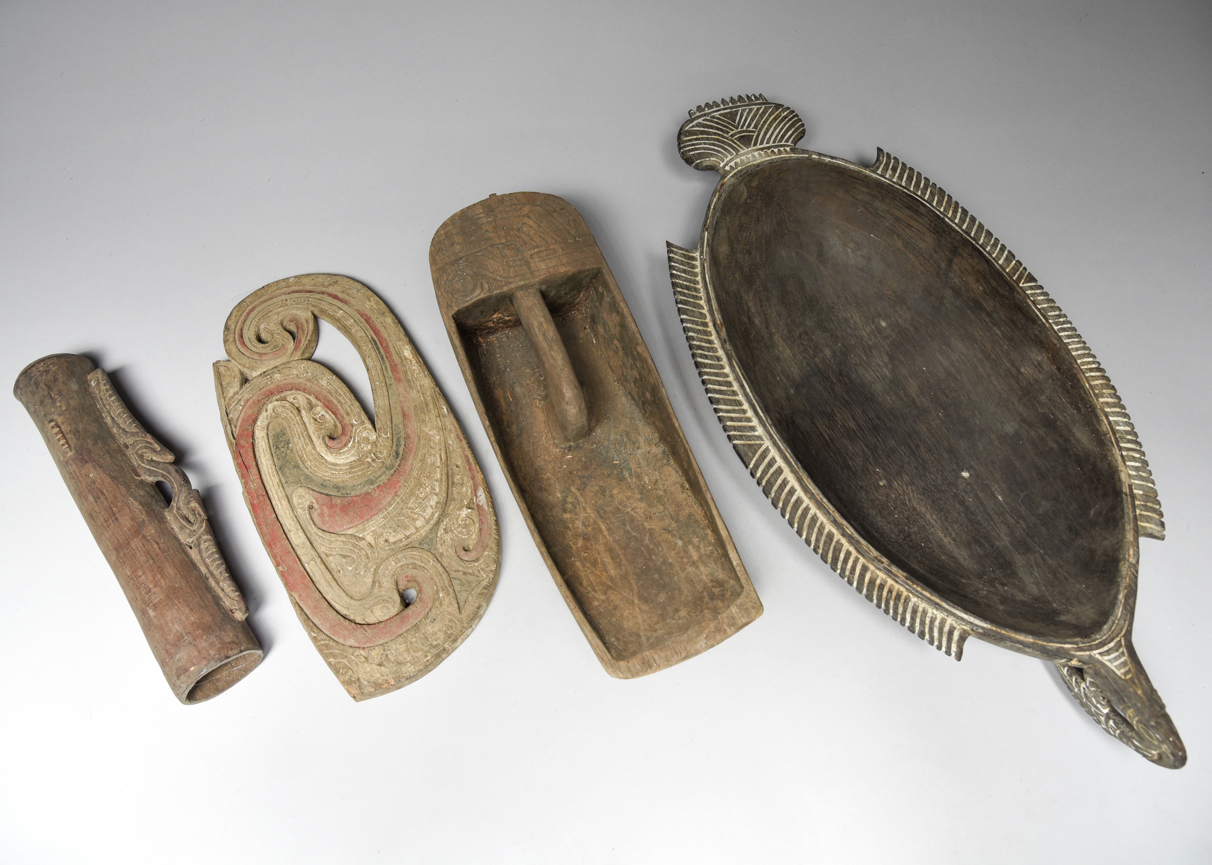 a Massim canoe prow fragment, 36cm long, a Massim bailer, 36.5cm long, and a Massim drum, 29.5cm long. (4)