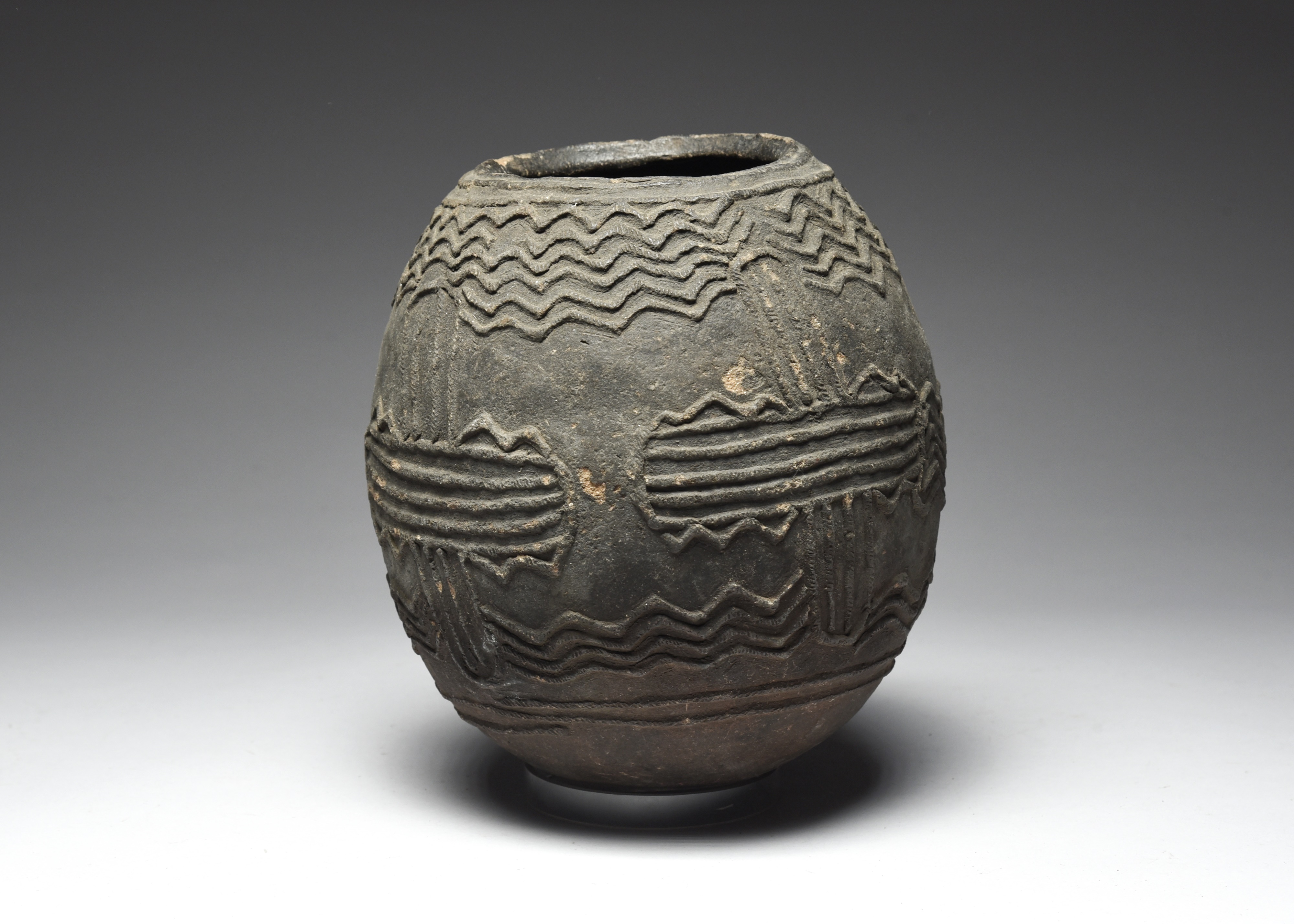 pottery, of ovoid form with raised linear decoration of zig-zags and crosses, the base with collection number A19 and inscribed Collingwood Bay ...,