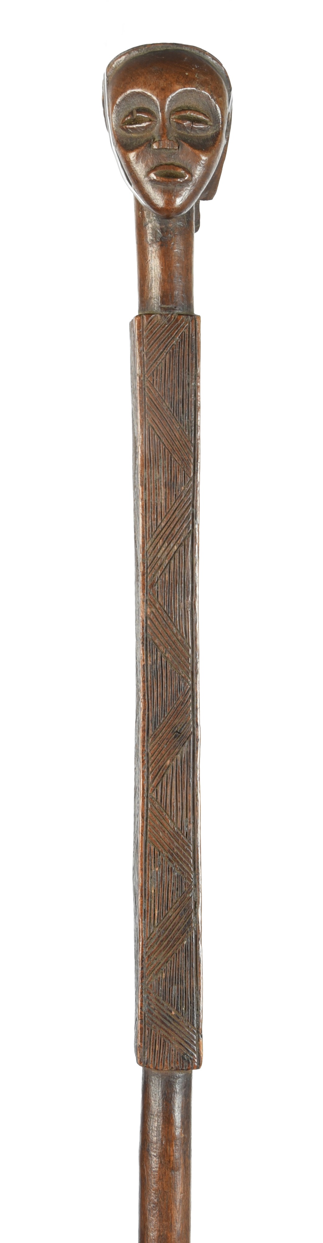 with a carved head finial having a linear and zig-zag coiffure, above a rectangular block with further carving and a cylindrical shaft,