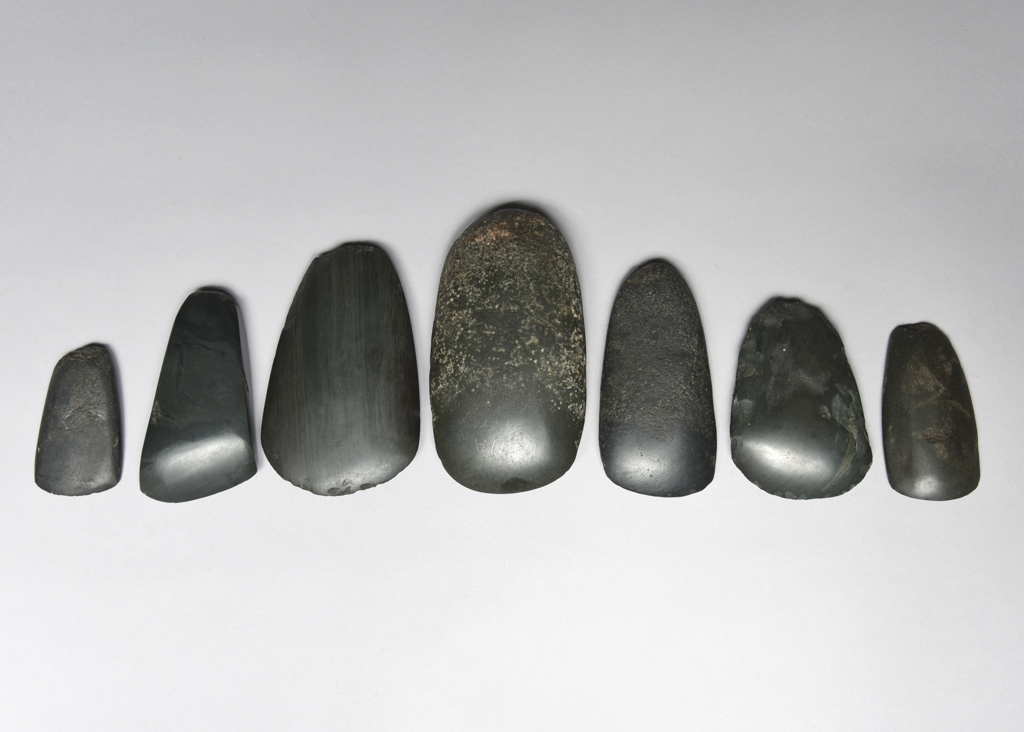 greenstone and basalt, variously inscribed; two FLY RIVER. NEW GUINEA, 11cm and 14.5cm long; NEW GUINEA, 13.5cm long; NEW GUINEA from Mr. Holmes 1947, 10.2cm long; HIGHLANDS NEW GUINEA, R.C.BERNDT, 12cm long, a New Britain greenstone adze blade, inscribed UANA STATION, LARANGE BAY, 16.4cm long, and an Aboriginal basalt adze blade, inscribed dug up in a suburban garden MELBOURNE, 8.5cm long. (7)