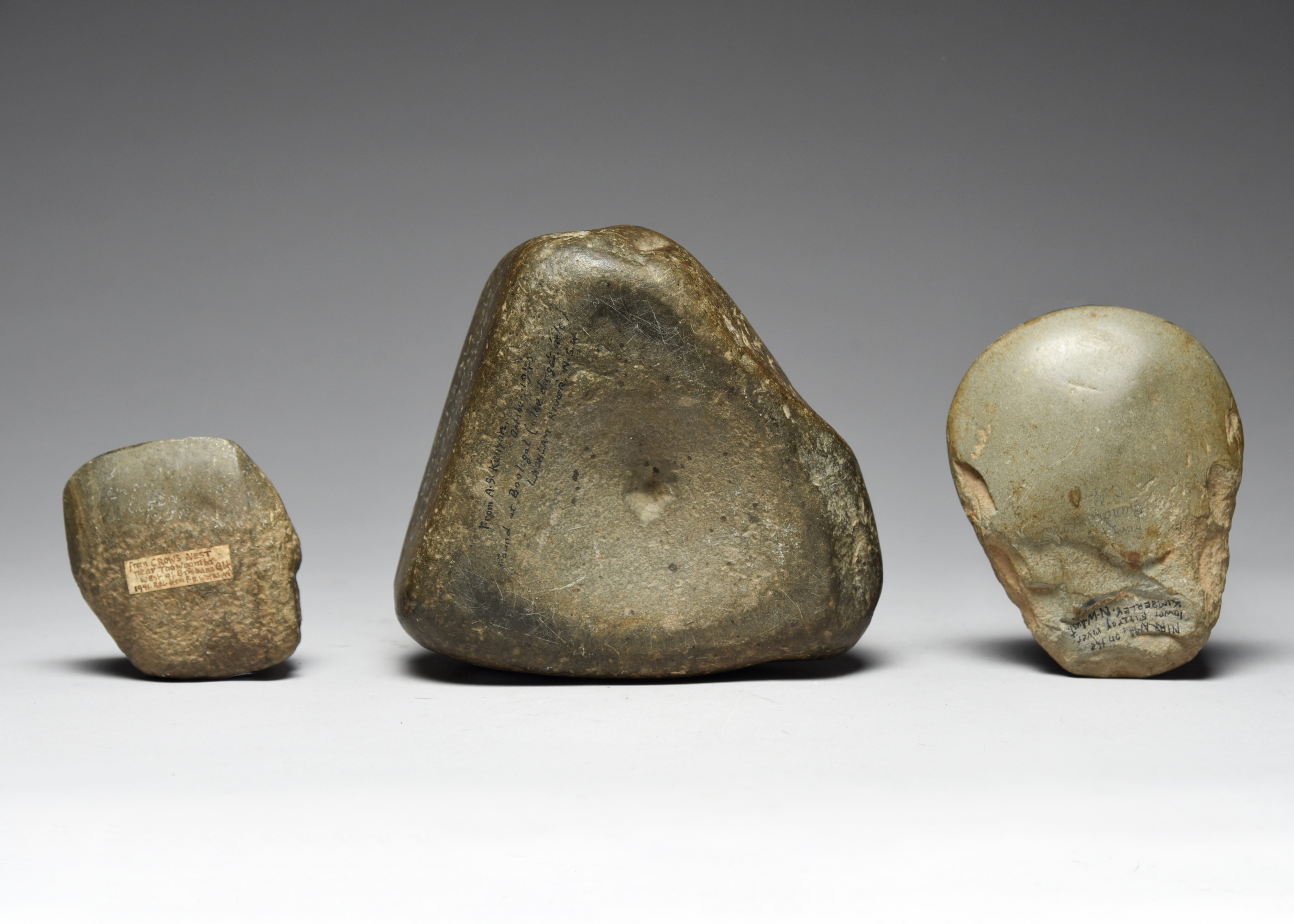 an Aboriginal stone axe head, with an inscribed label from CROW'S NEST near TOOWOOMBA West of Brisbane Qld 1941. Rec. from P.E.Worms 1943, 8cm long, and an Aboriginal stone axe head, inscribed NIRRAMA, on the lower Fitzroy river, KIMBERLEY, N.W.Aust., 12.2cm long. (3)