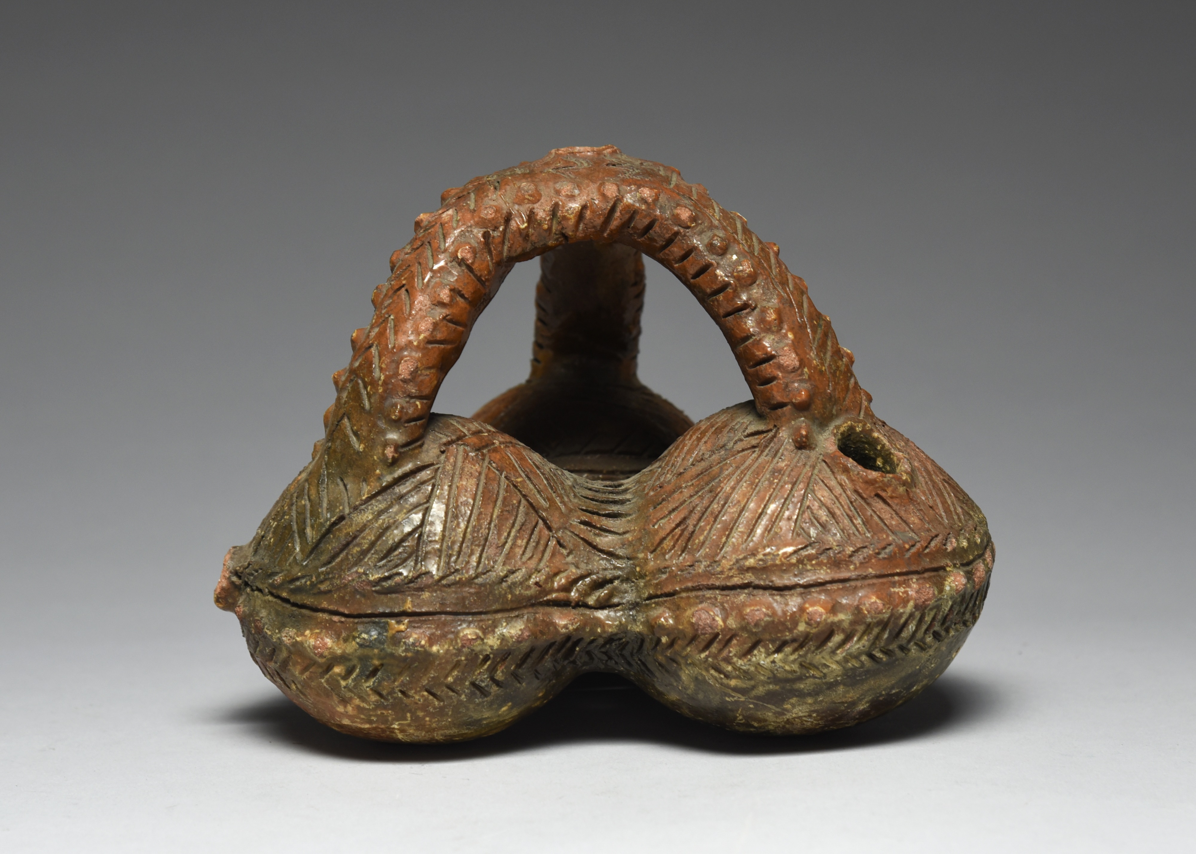 earthenware, with three linked chambers, one with a filling hole and another with a spout, with an arching handle, having a central hole for suspension, the whole with raised beads and incised linear decoration,