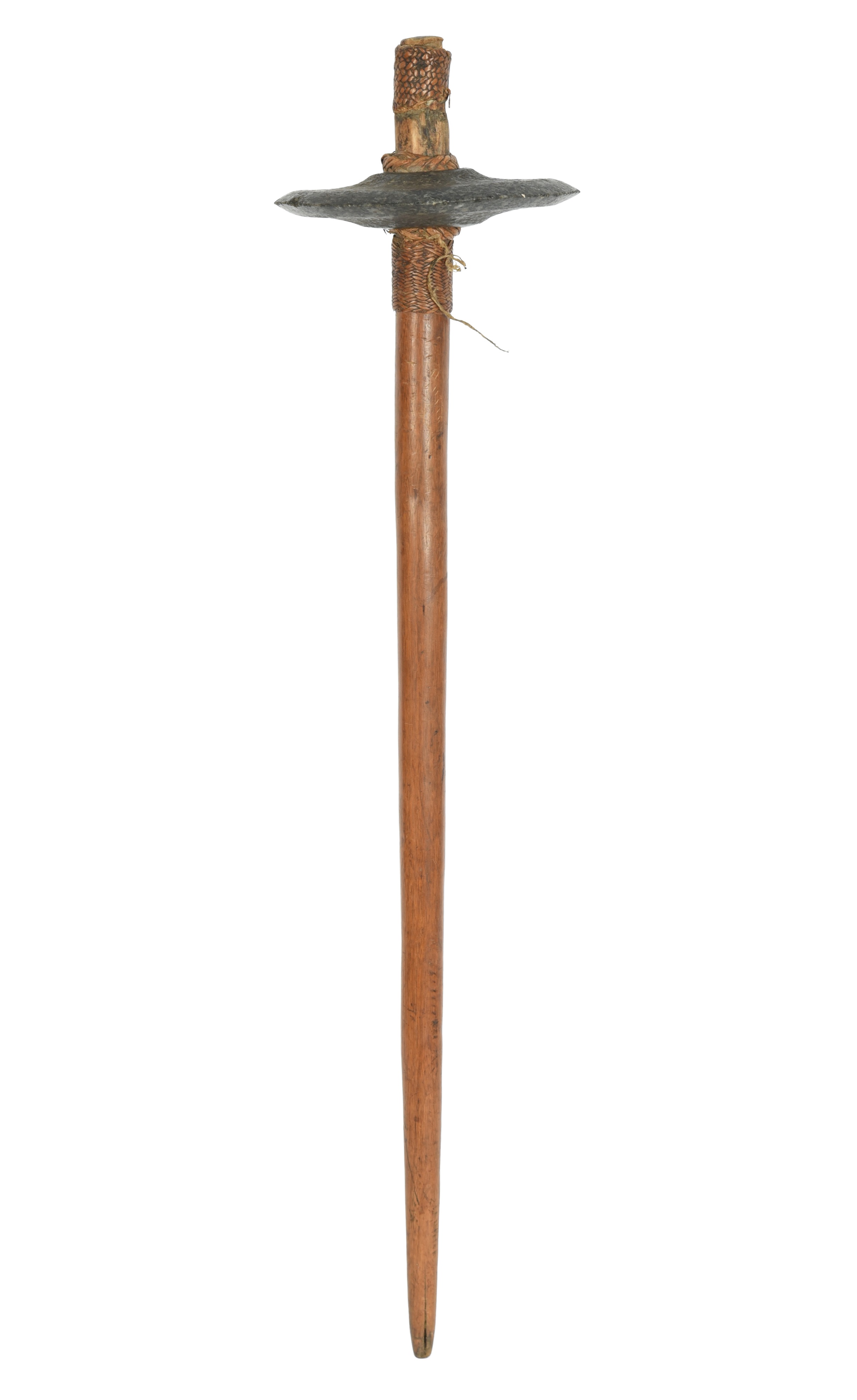 with a stone disc head having a channelled band either side, on a wood shaft with woven fibre mounts, with collection numbers on the shaft, A22a, and on the blade A22b,