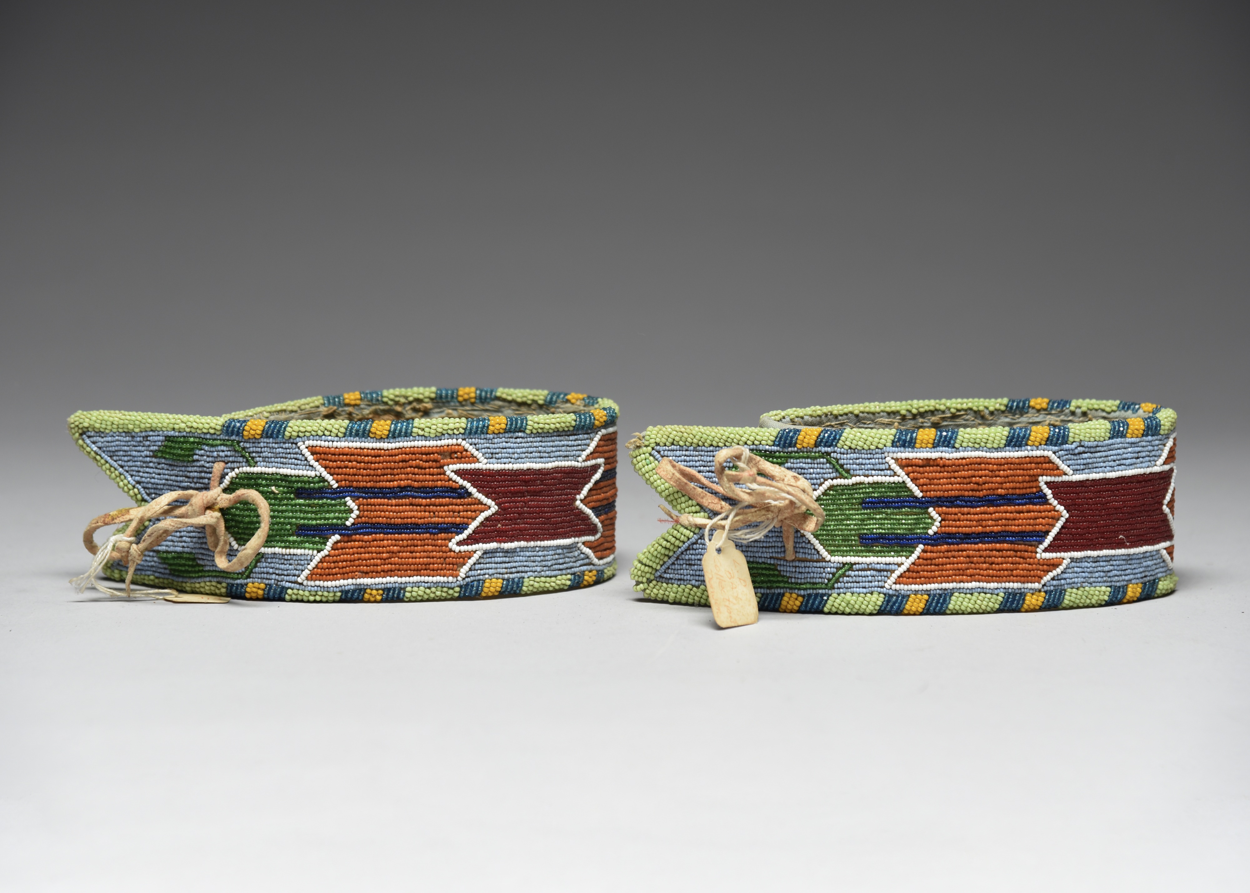 coloured glass beads with a geometric design, one end bifurcated and with buckskin ties,