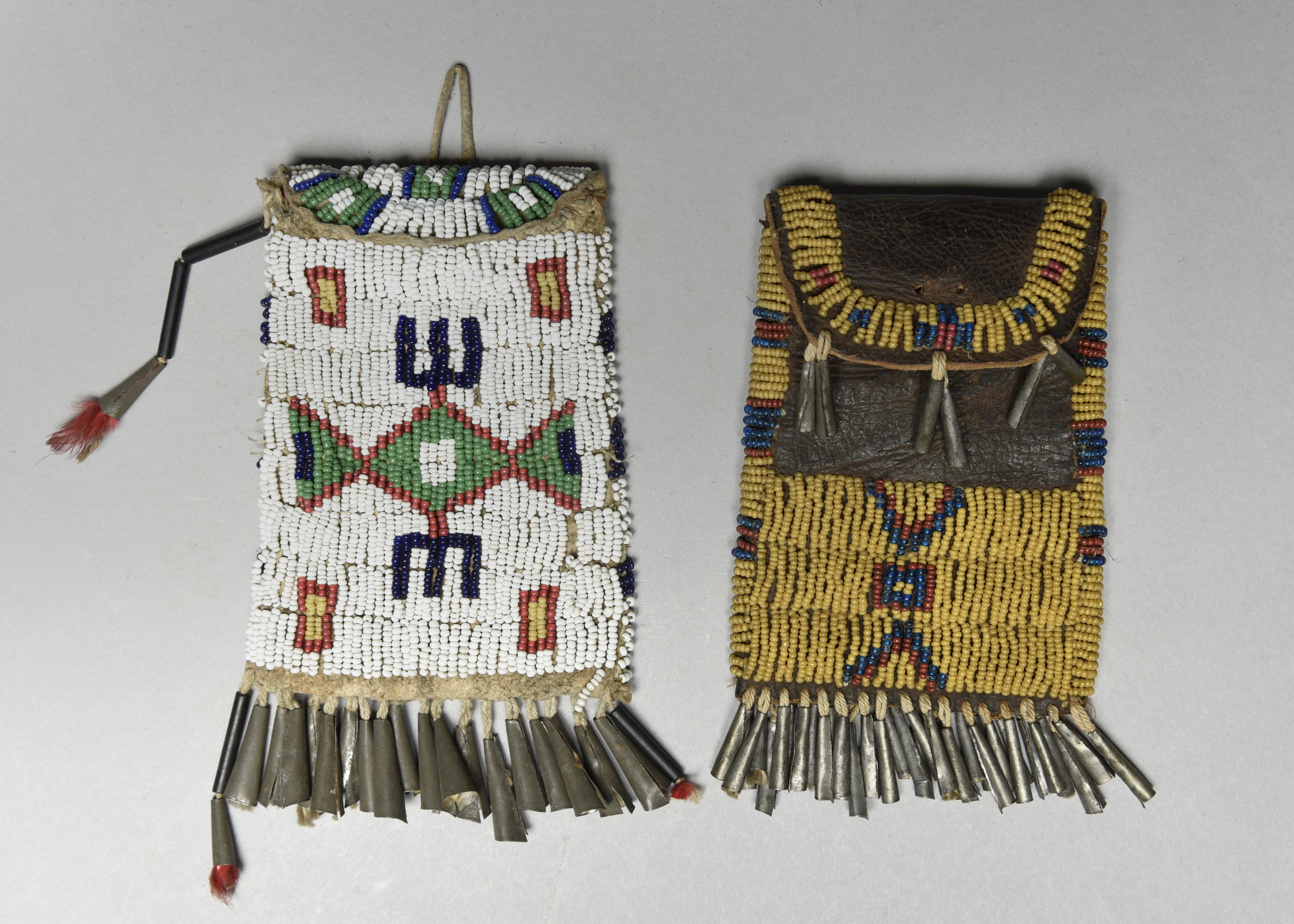 buckskin and leather with coloured glass beads and tin cones, with geometric designs to the fronts, the Ute inscribed to the back OCT 1, 1948 RIELICH,