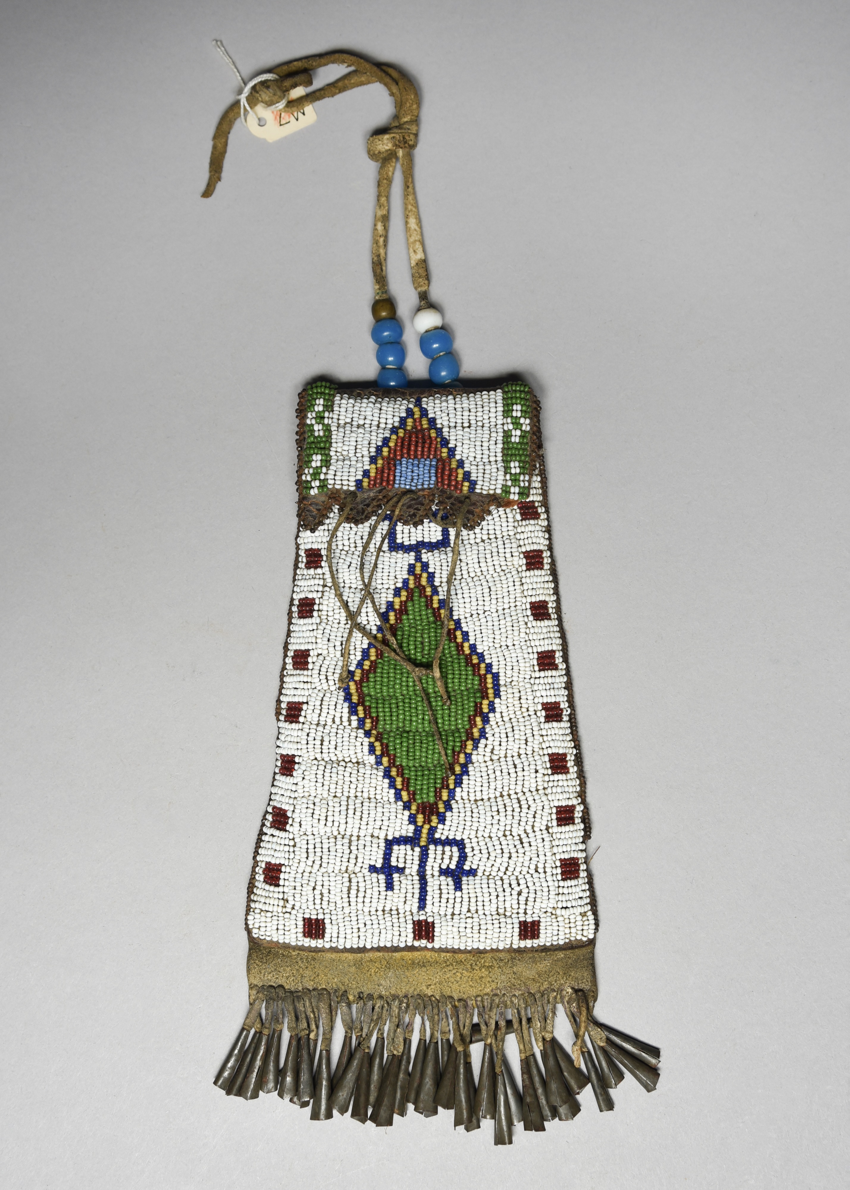 buckskin, leather, coloured glass beads and tin cones, the front and flap with geometric designs and with a conforming border to the back,