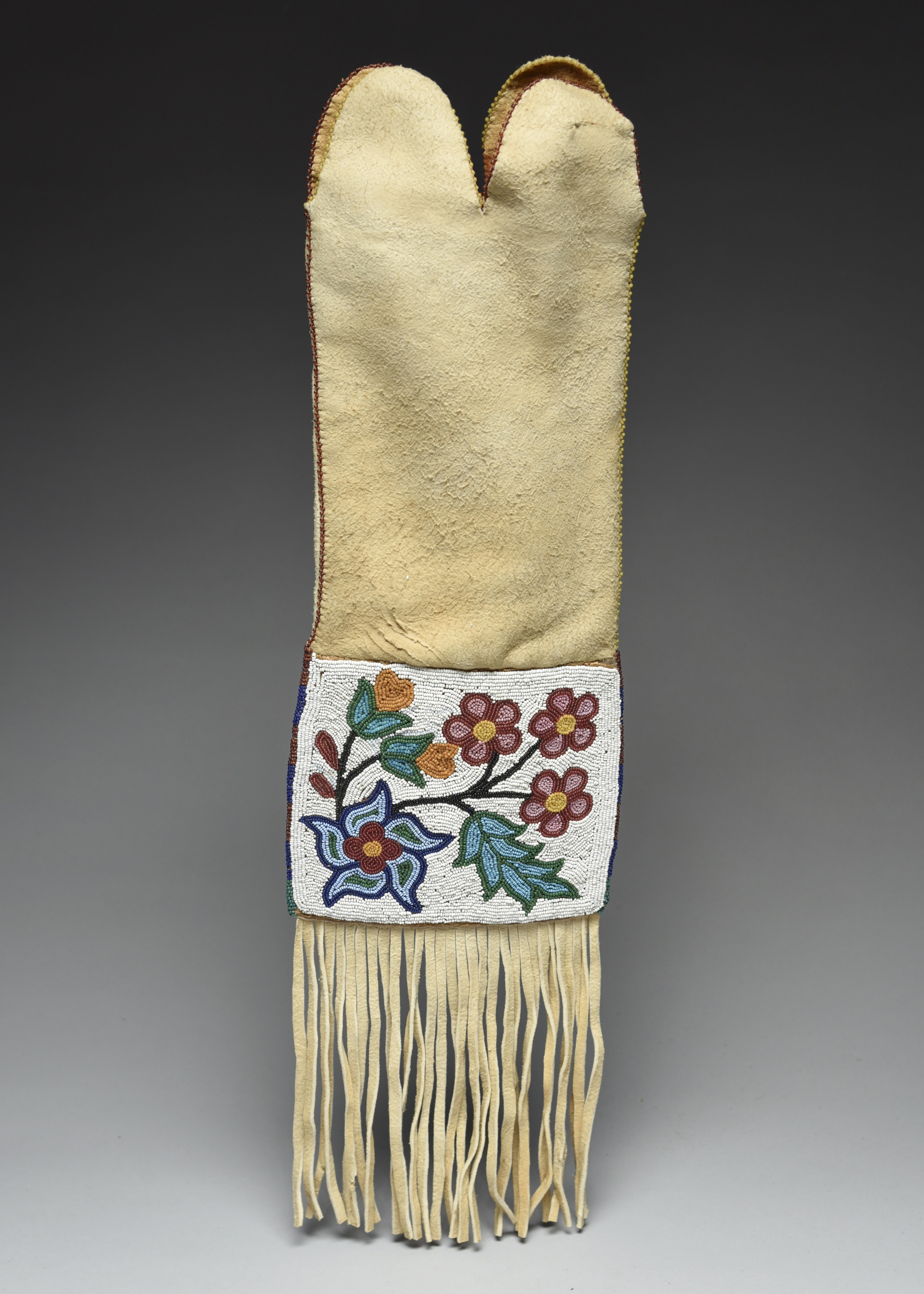 buckskin with beaded edges and tassels, with a Cree beaded panel having a foliage design,
