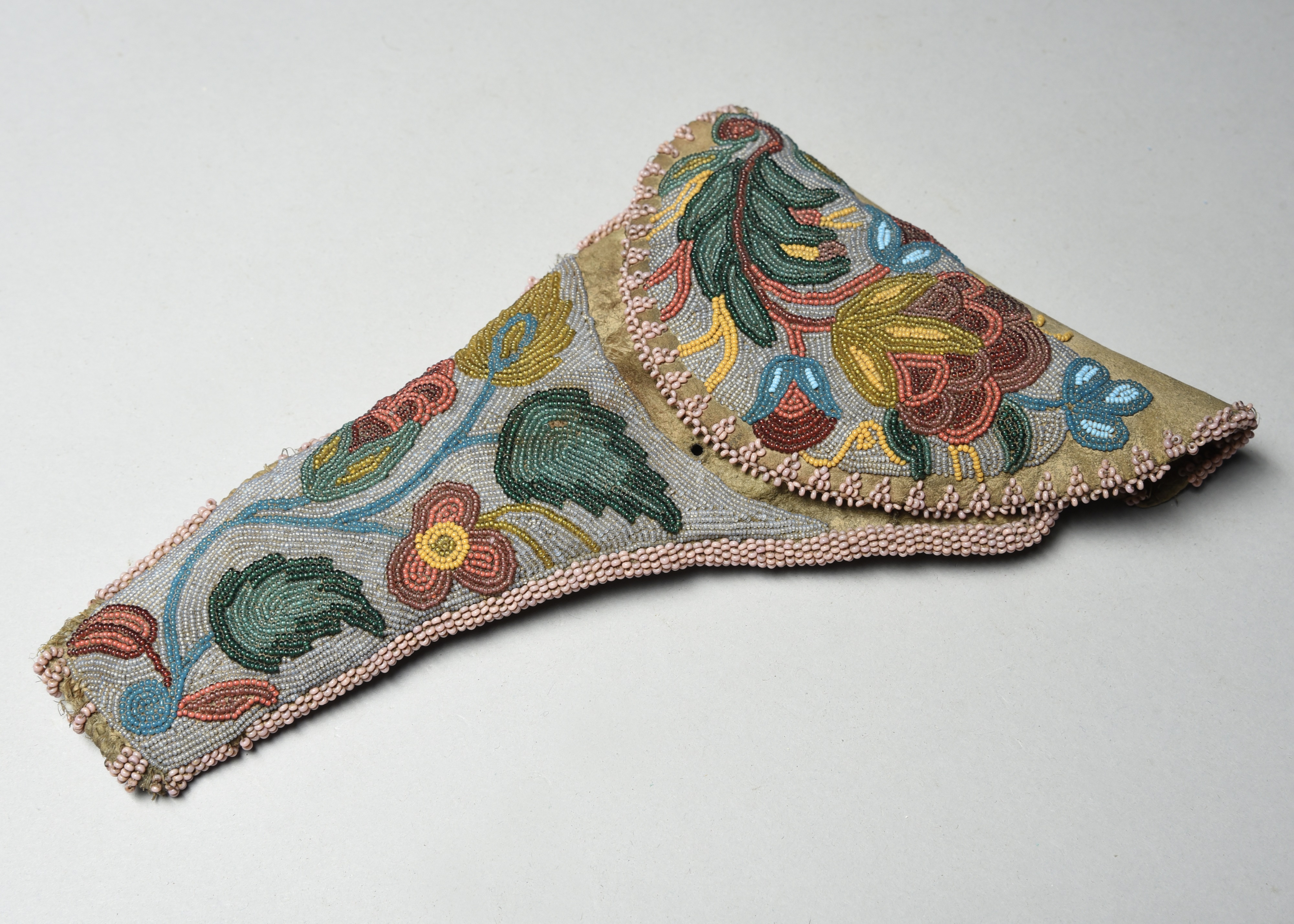 buckskin with coloured glass beads of floral designs to the front and flap, the back with a belt loop,