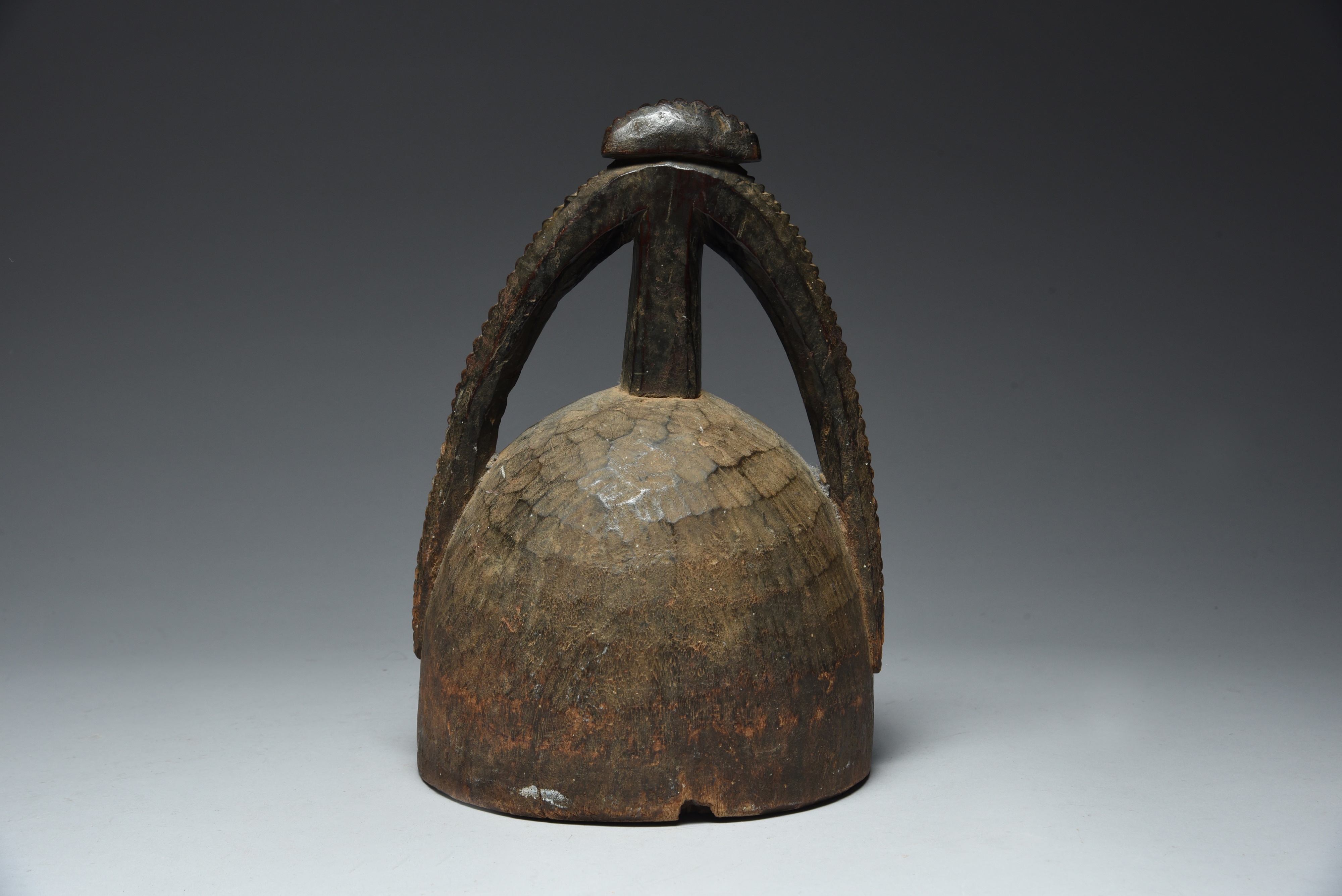 domed with a crested double handle, with a chip carved edge,