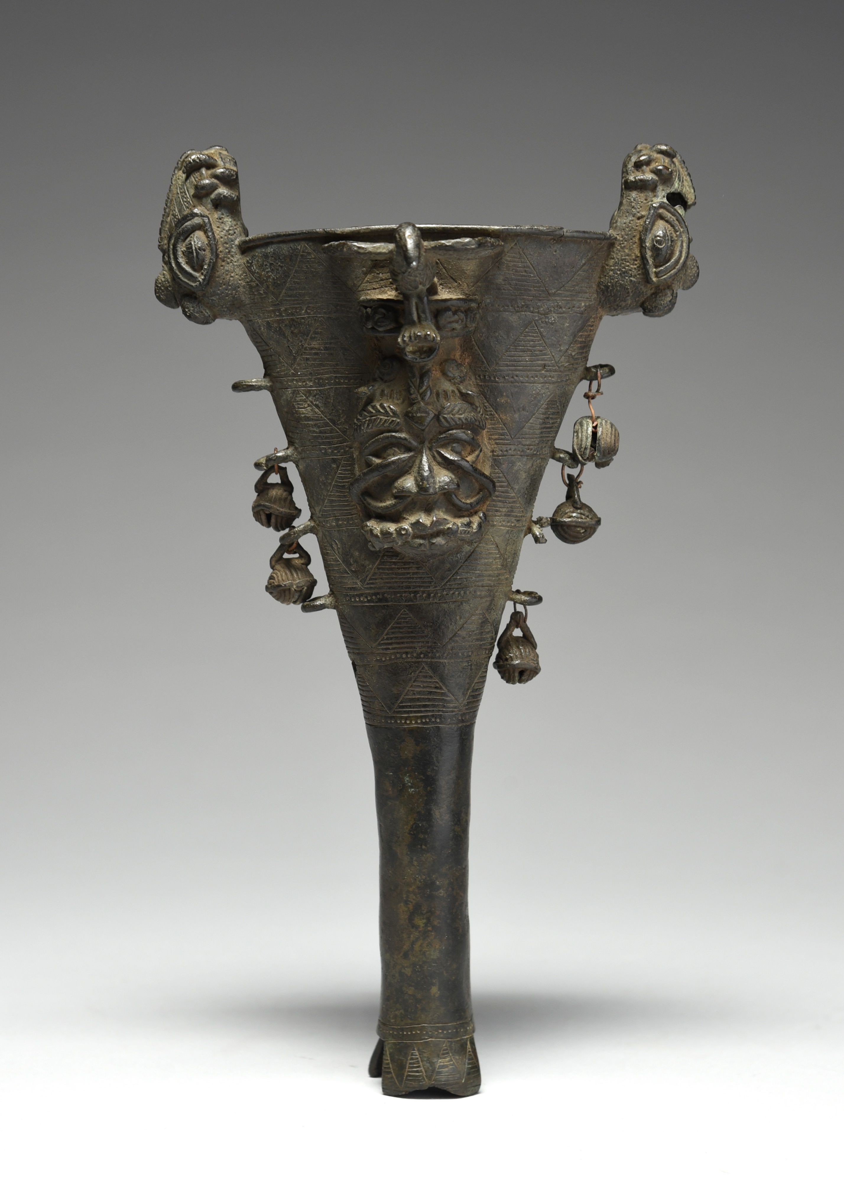 cast bronze of tapered form, with part incised linear and dot decoration, with a pair of leopards heads to the top ends and a central head with serpents and a bird crest, the sides with ring attachments and five applied bells, the flared terminal with cut sides and conforming incised decoration,