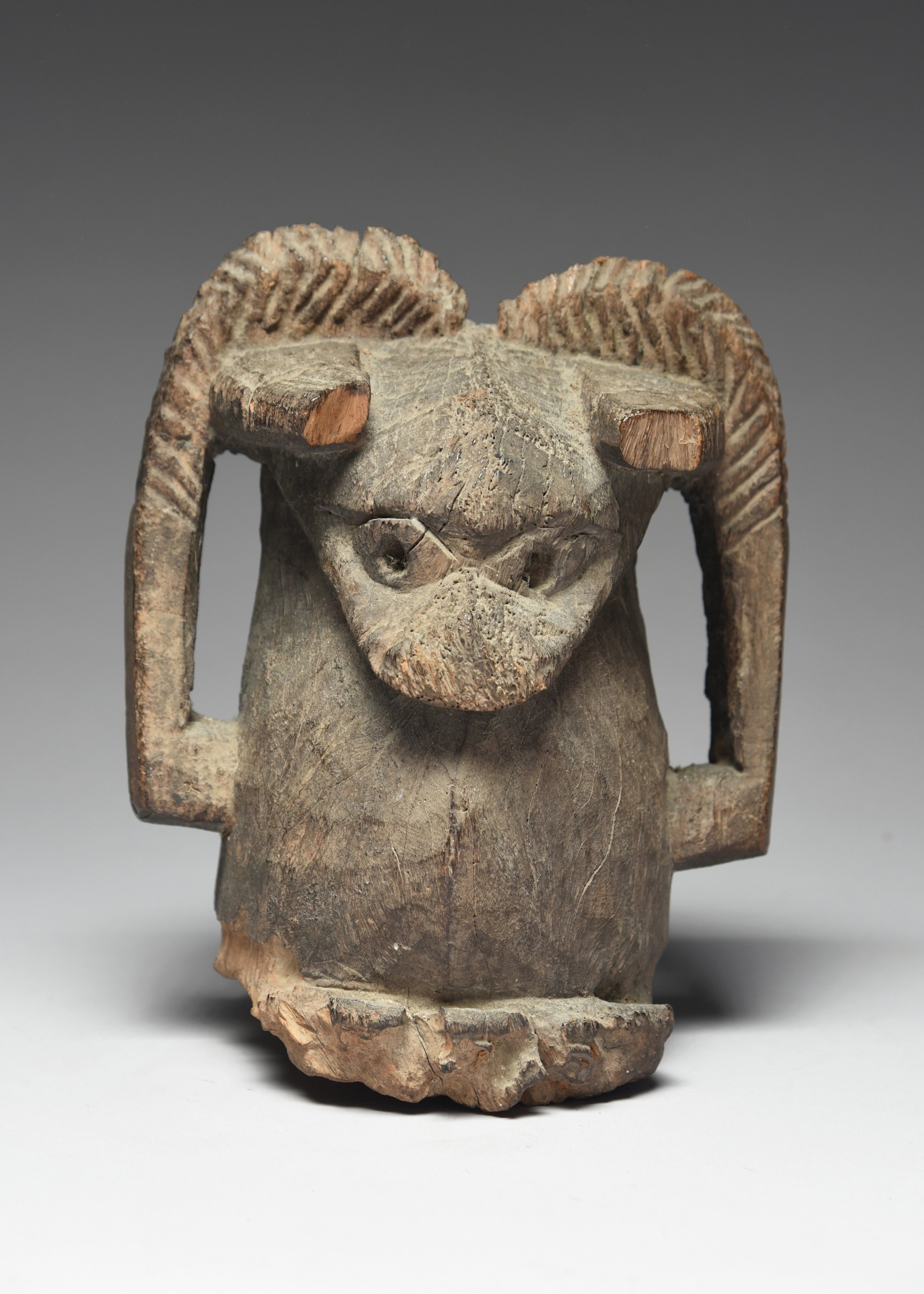 carved with a pair of part ribbed horns, the back carved out and with a pierced top for alter attachment, and with a blackened patina,