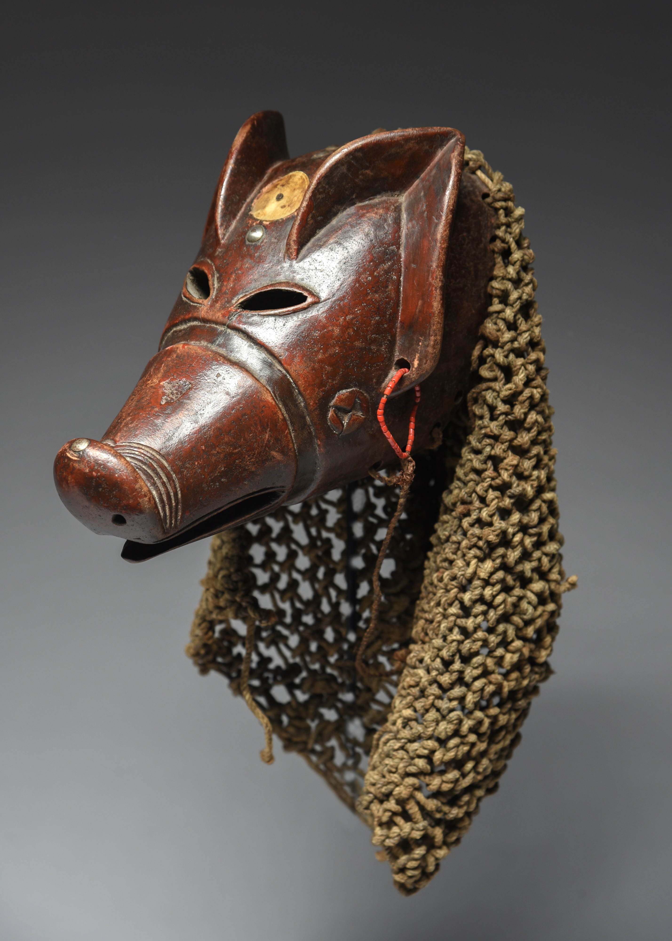 carved as a pig head with pierced ears and eyes, with a recessed band below to carved curved lines and a pierced snout and open mouth, relief scarifications to the sides, with an inset bone disc and applied metal studs, with beads, pigment and a knotted fibre net back,