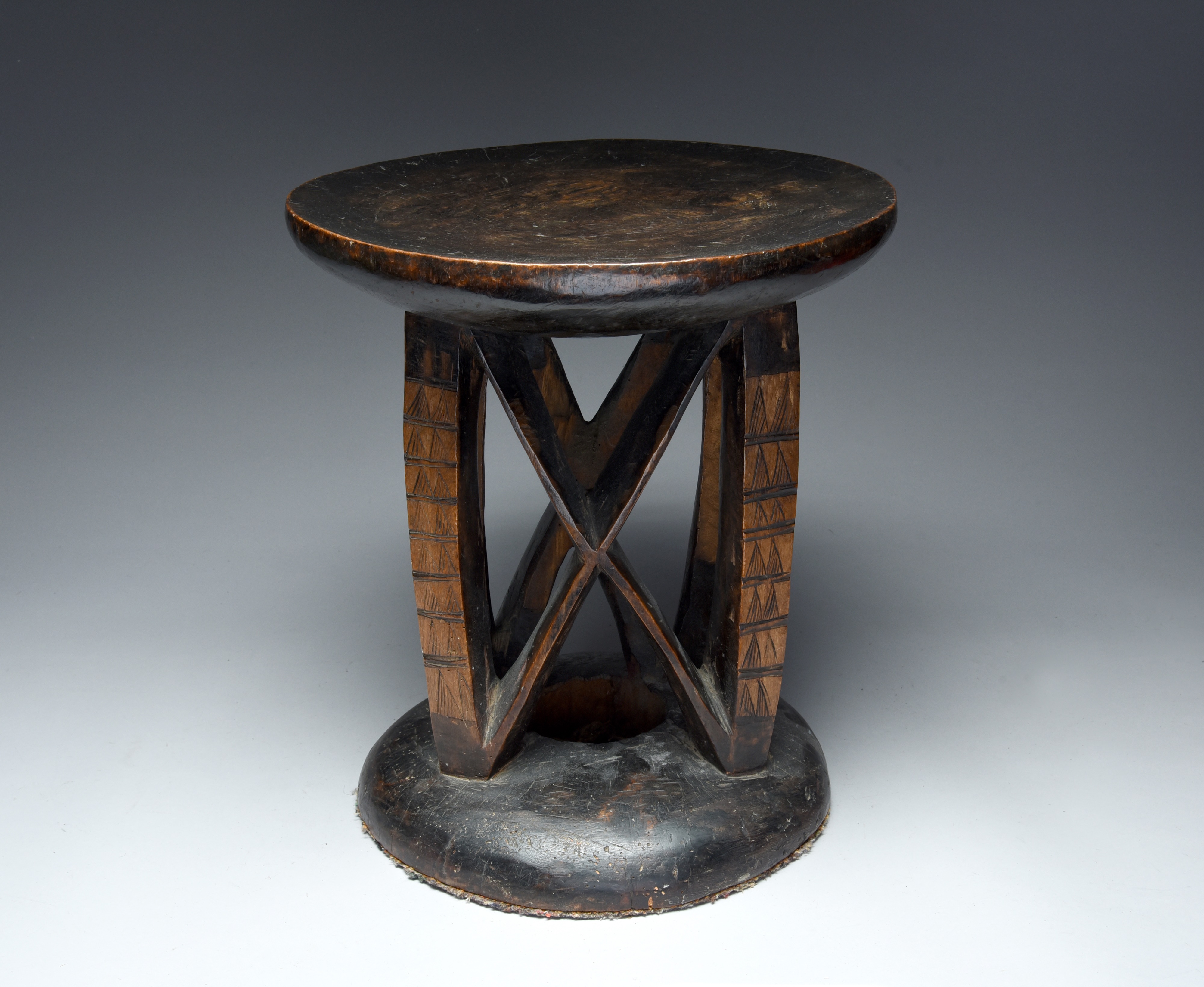with a circular dished top with scorched decoration including rows of triangles to the uprights of the twin X supports, the base with a central hole,
