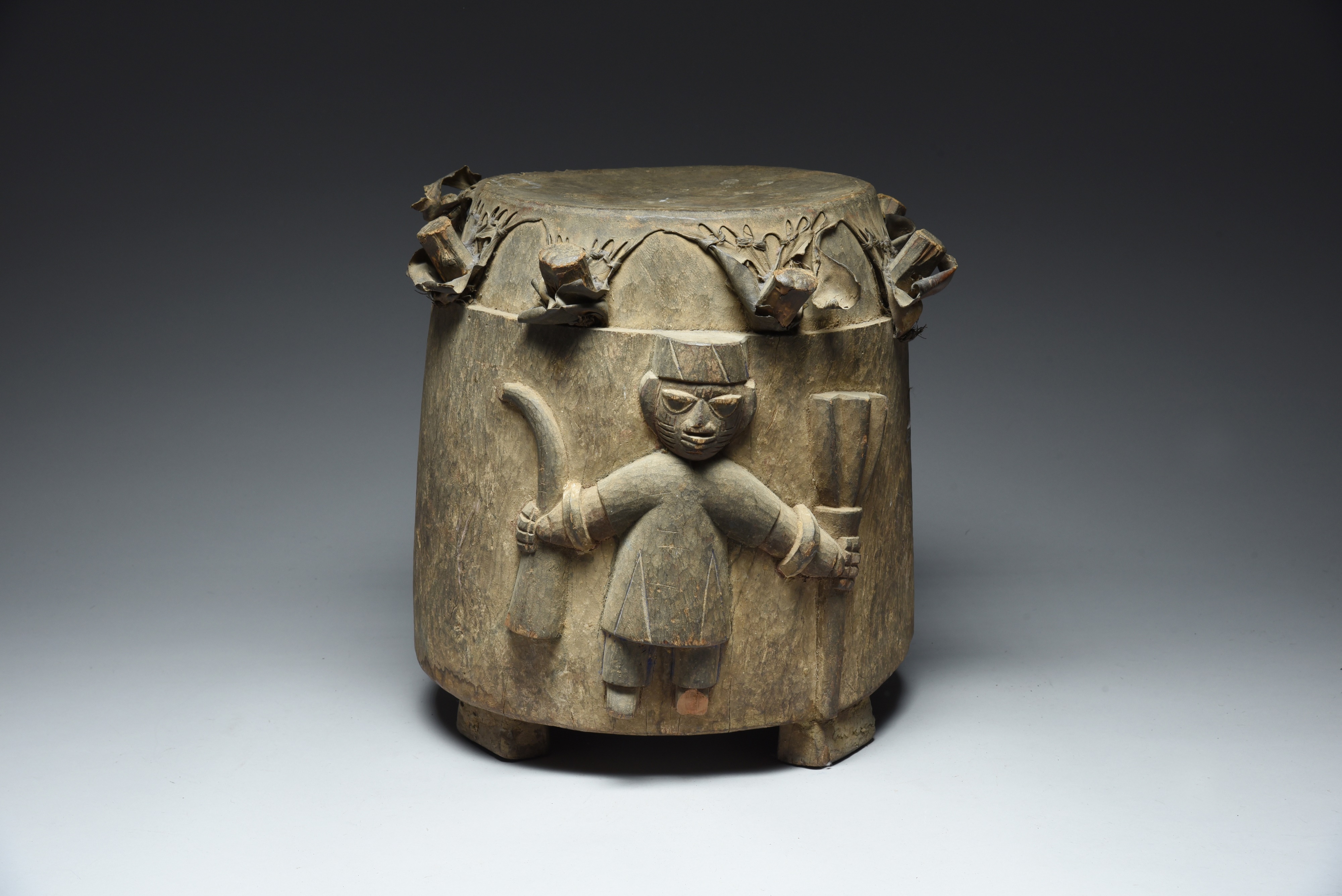 and two Nigerian drums, one with a leather skin, 60cm high, and the other with a reptile skin, 43cm high. (3)