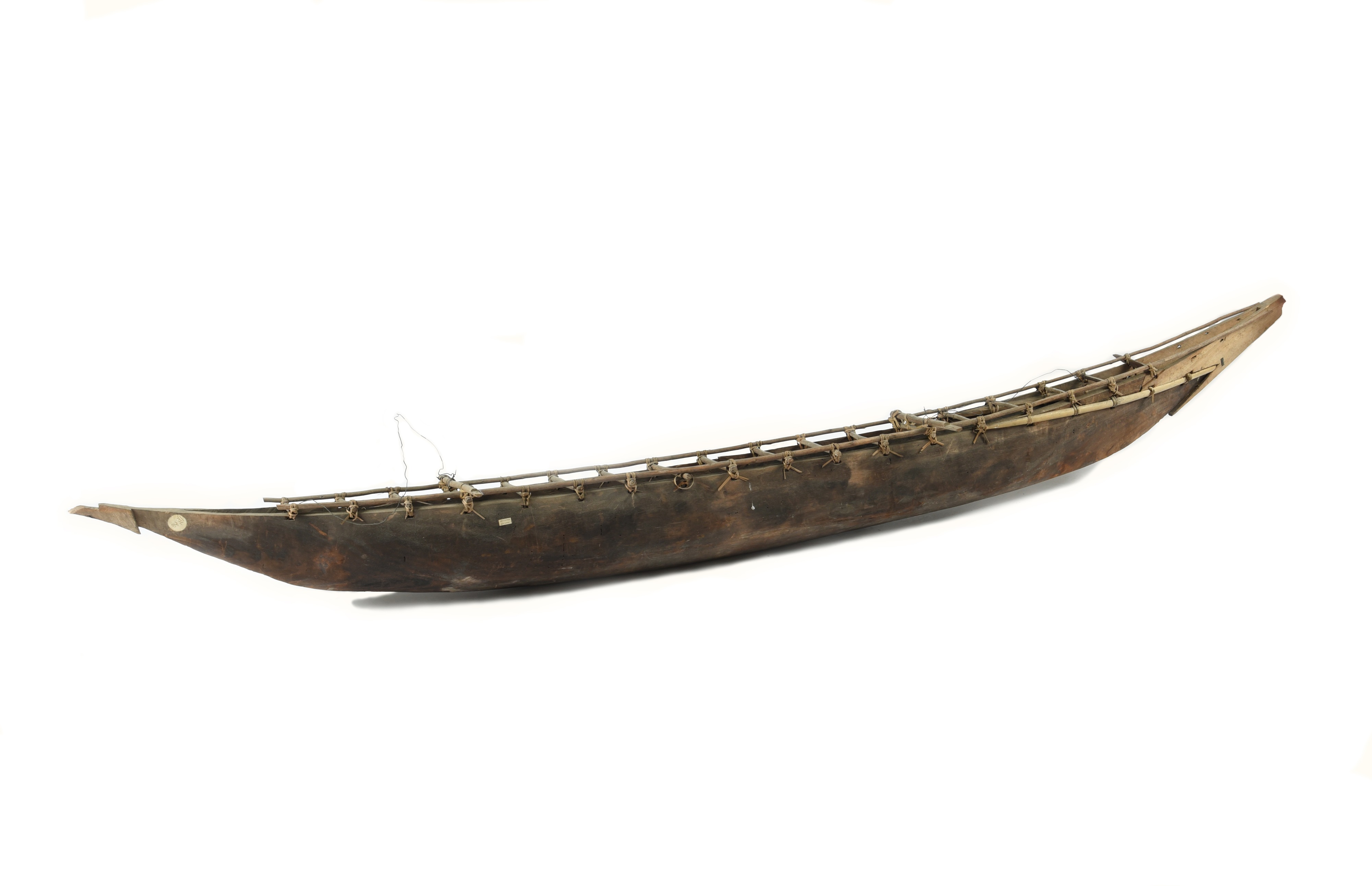 the carved out and burnt hull with a leaf fibre bound top frame, inscribed Model Canoe with outrigger Nicobar Islds. d.d. E. H. Man., Nic.2, with sticker ABBEY MUSEUM NEW BARNET and BERKELEY GALLERIES, 20 DAVIES STREET, W.1., inscribed 53 E.d., and a sticker inscribed 2 Nic,