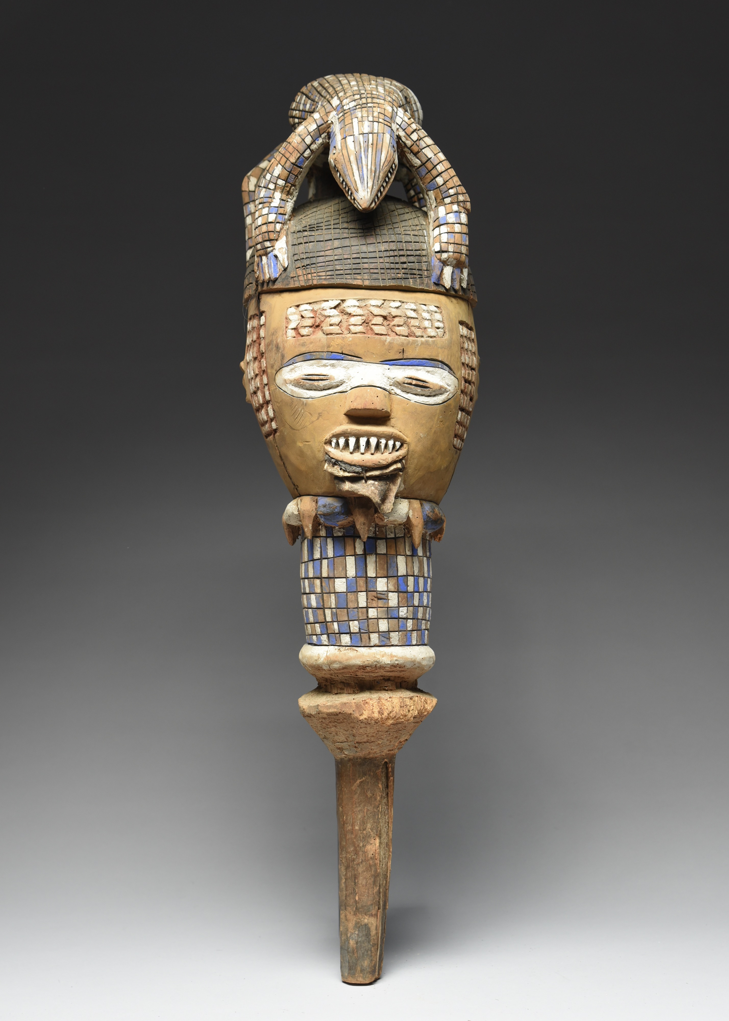 carved with a pangolin crest, with its long tail running down the back of the head, with three panels of facial scarifications, filed teeth and the bottom lip with hair and resin with a nailed piece of leather, above a pendant collar, with pigment decoration,