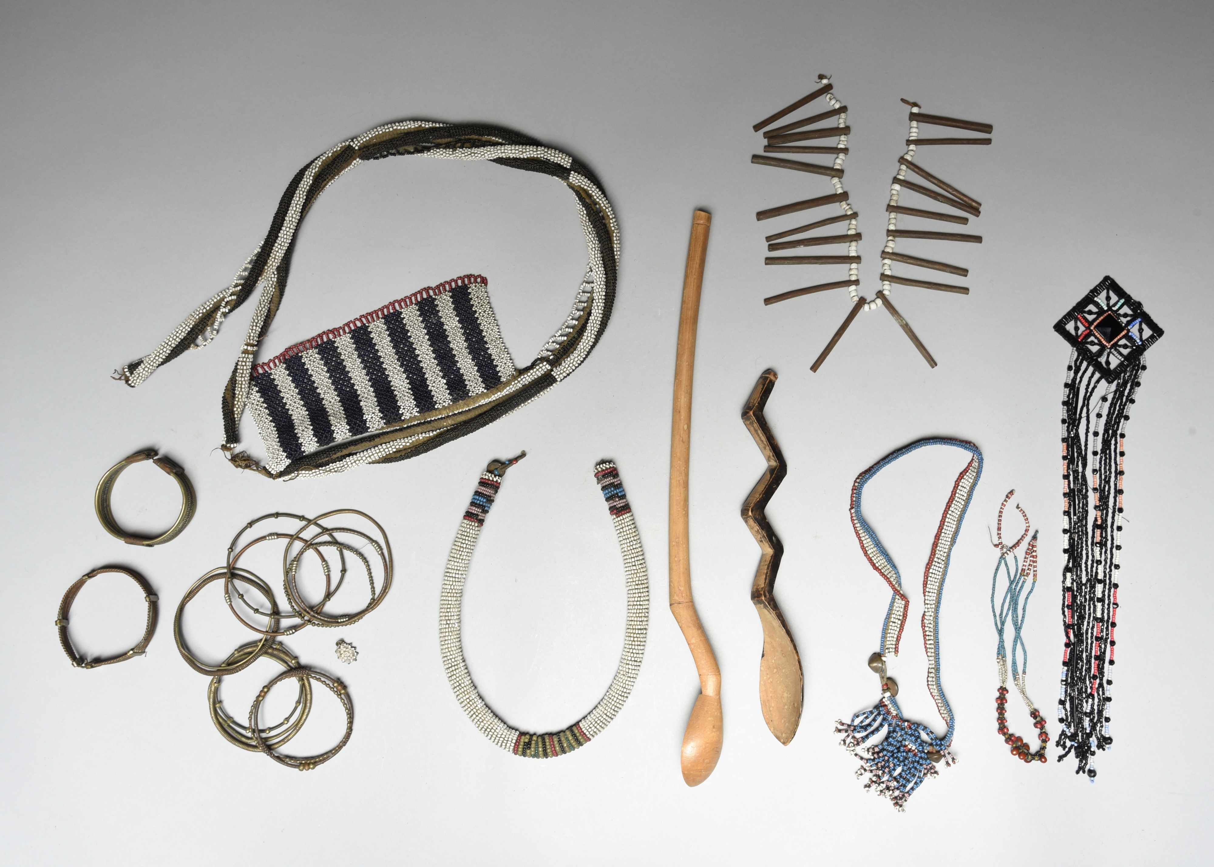 three Zulu beaded necklaces, one tubular with a brass button, a Zulu wood and bead necklace, 35cm long, a bead and cloth ornament and fourteen Zulu brass and copper wirework bangles, and two Zulu spoons, one with a zig-zag handle and part ebonised, 39cm and 25cm long. (22)