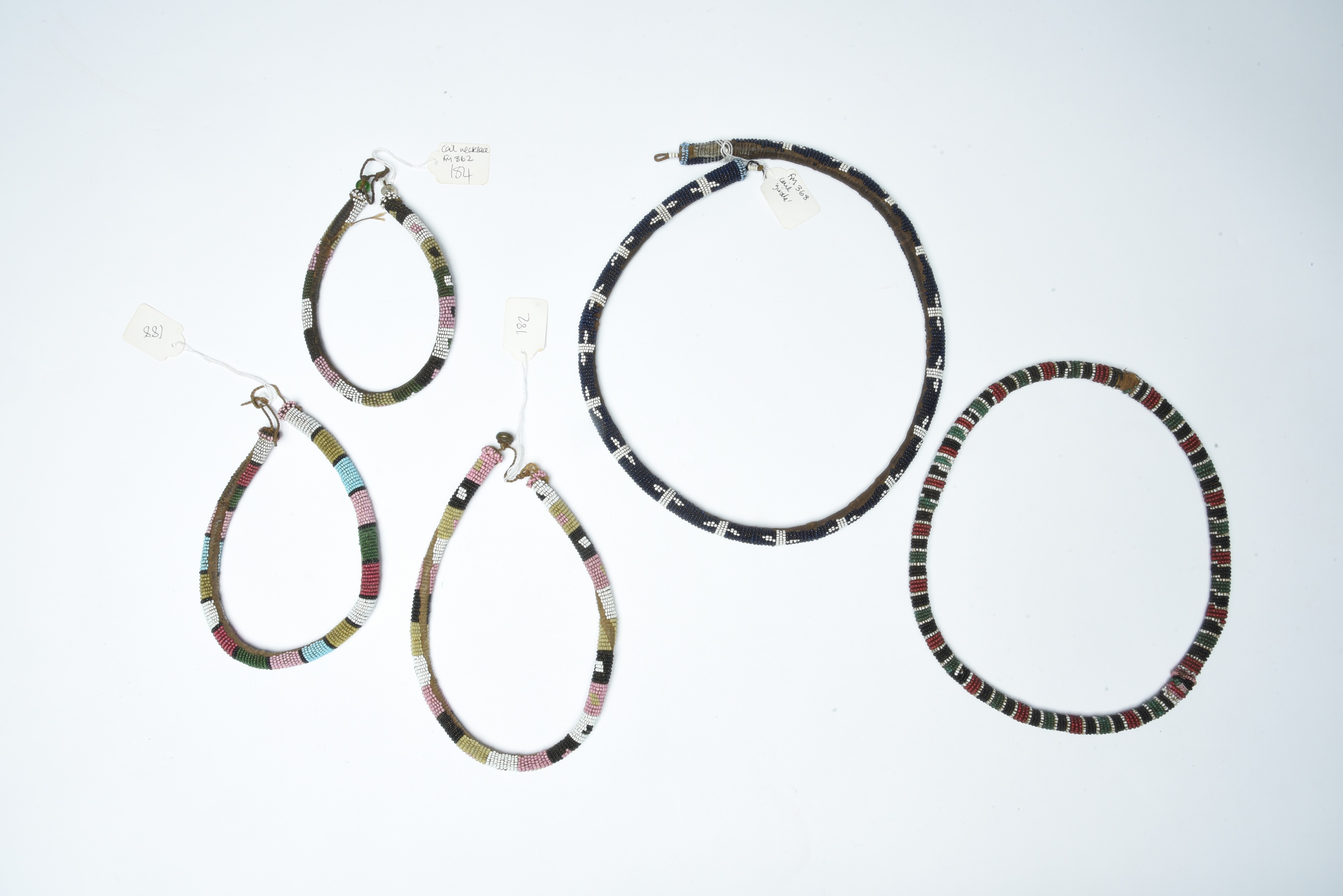 a Zulu necklace, with similar bands of beads, 16cm long, a Zulu beadwork joined necklace, 25cm long, and a Zulu blue and white beaded waist band, 28cm diameter. (5)