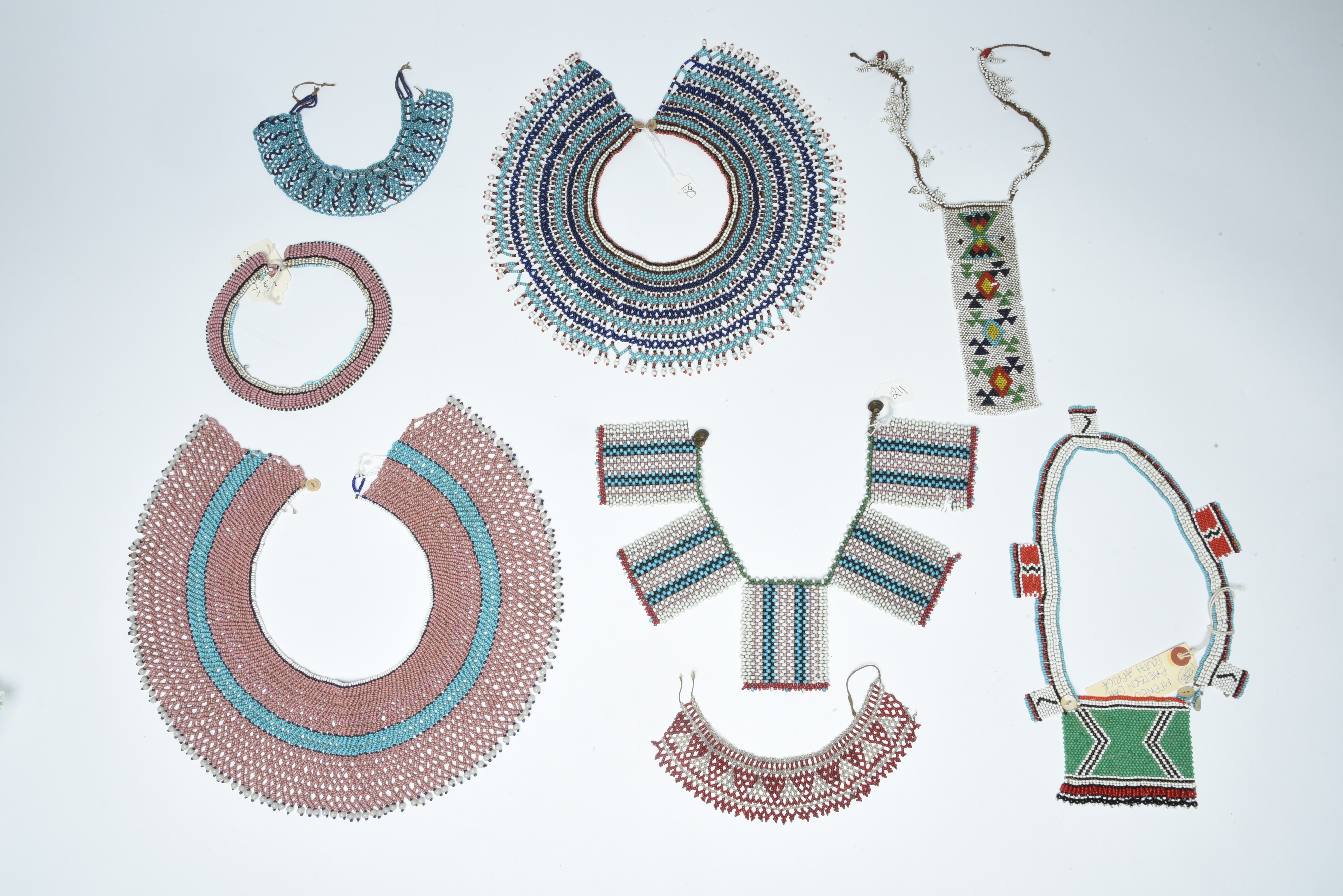 a Xhosa small beaded necklace, with a mother of pearl button, 15cm diameter, a Zulu five panel beaded neckpiece, with brass buttons, 34cm long, a Mfengu beaded panel neckpiece, with two mother of pearl buttons, 28cm long, a Sotho beaded necklace, with a long geometric patterned panel, 33cm long and two Xhosa small beaded neck collars, 20cm and 20.5cm wide. (8)