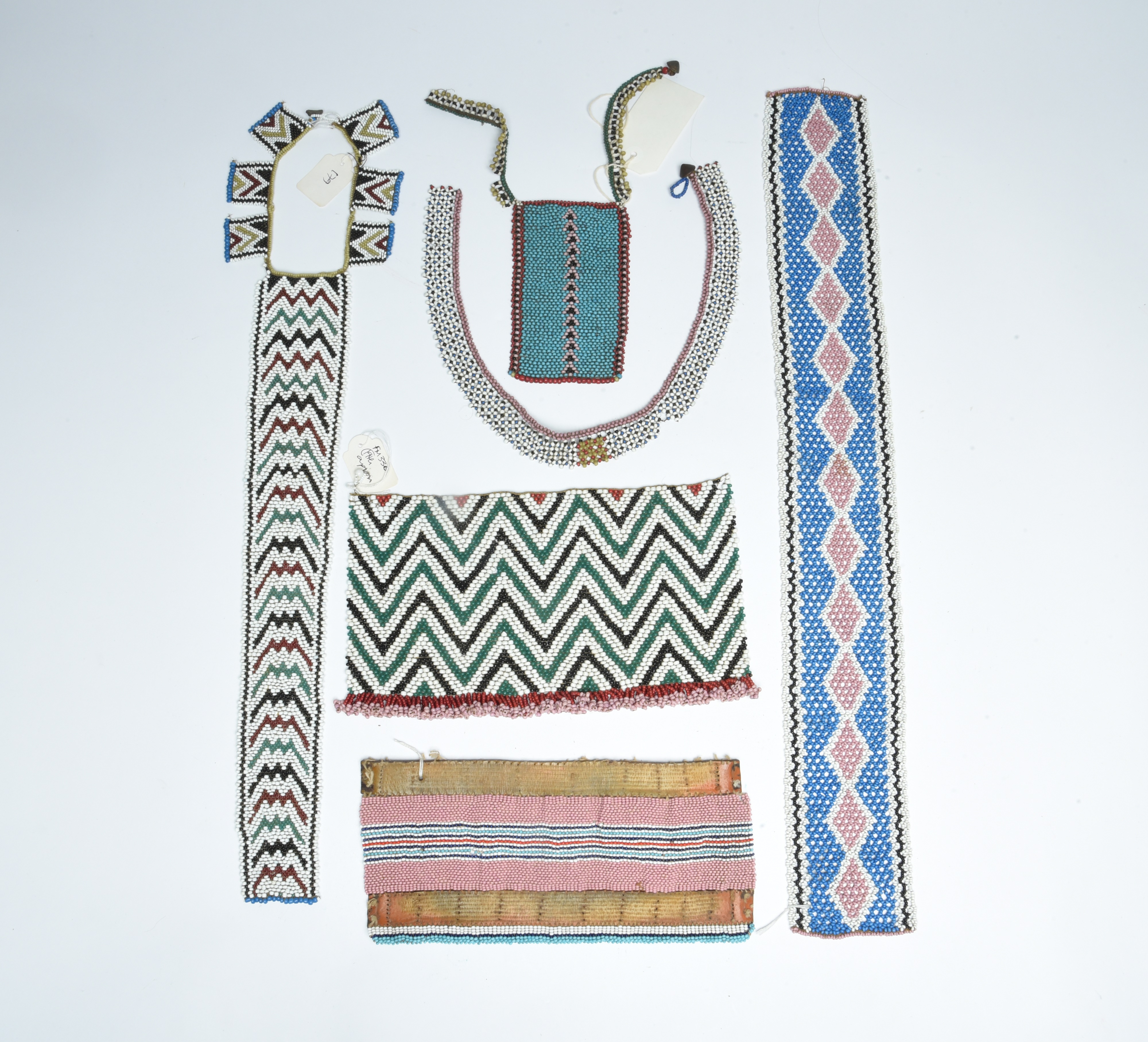 a Xhosa beaded and leather armband, 25cm long, a Zulu beaded panel, with zig-zags, 27cm wide, an Xhosa beaded panel, 60cm long, a Zulu neck panel, with a brass button, 27cm long, and a Zulu beaded neck collar, with a brass button, 47cm long. (6)