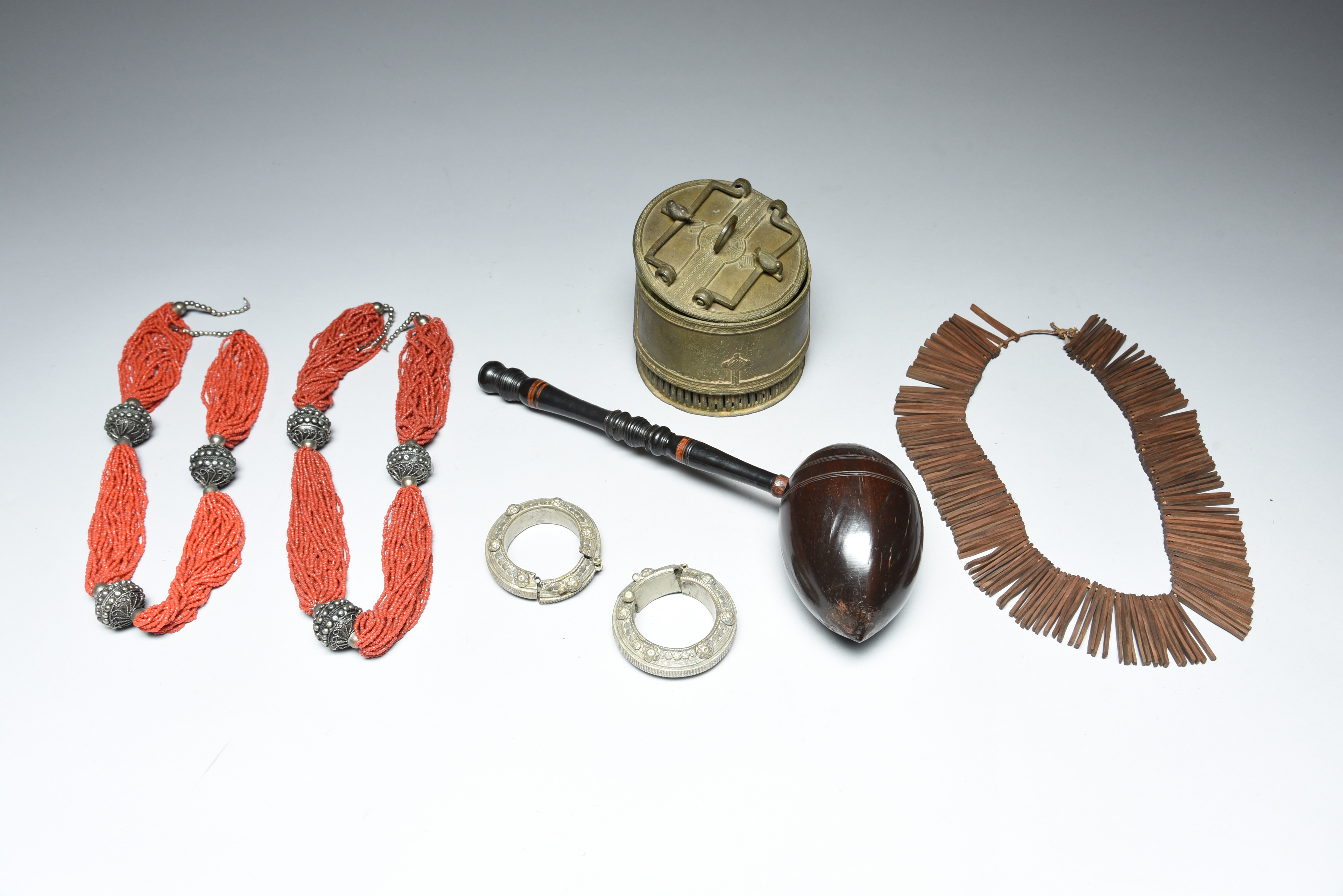 a coconut ladle, with a turned lacquer handle, 29.5cm long, two Omani glass and silver coloured metal bead necklaces, 72.5cm and 75.5cm long, a pair of cast metal bracelets and a Zulu wood necklace, 29cm long. (8)