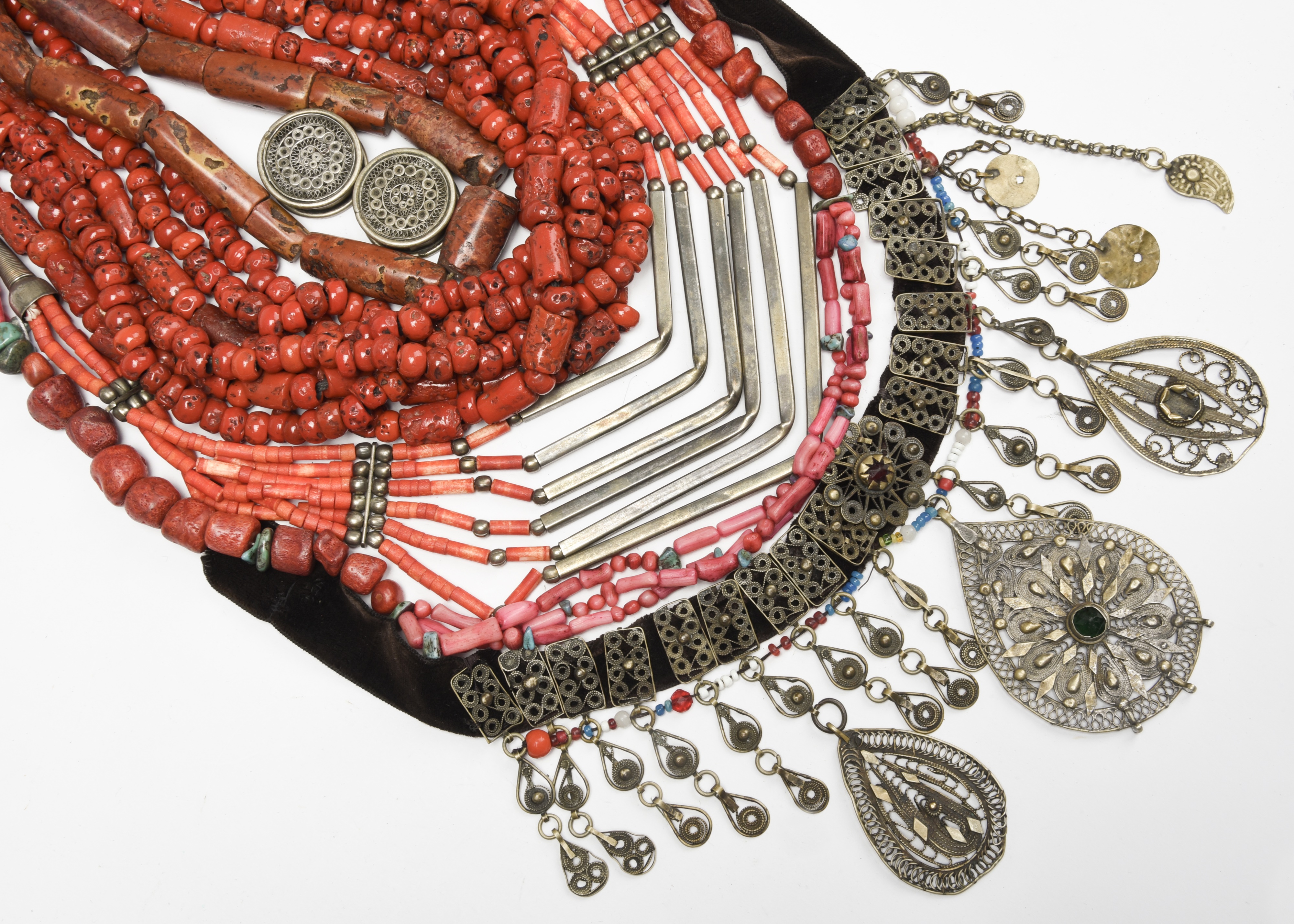 three coral necklaces, a graduated crescent necklace, an Indian multi-strand glass bead necklace, a stone bead necklace, three middle eastern necklaces, a pair of filigree ear ornaments and two Bedouin face veils, fabric with beads and metal discs, 41cm long. (15)
