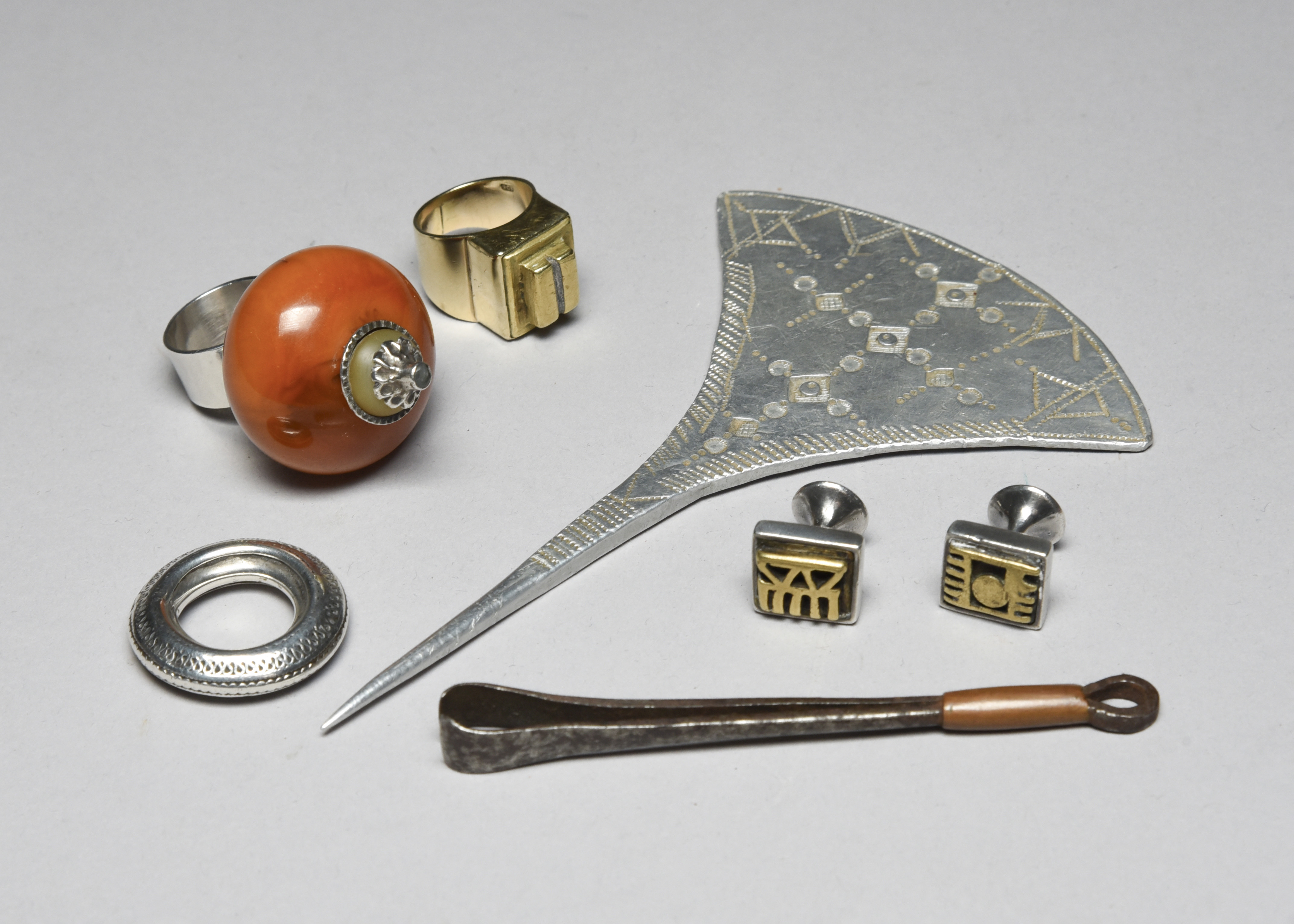 a pair of Maasai iron and copper tweezers, 9.7cm long, an Ethiopian silver coloured metal wedding ring, a Tibetan copal amber bead set ring with silver coloured metal mounts and a ring and a pair of cufflinks, inset Akan brass gold weights. (7)
