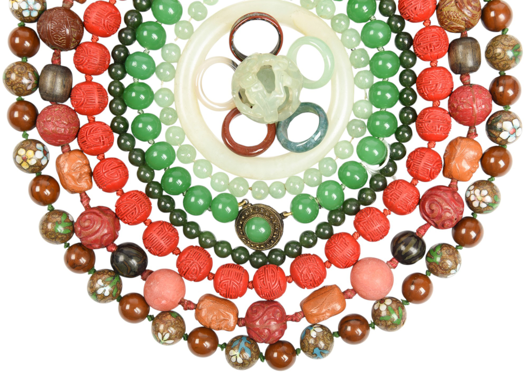 glass, wood and cinnabar, four agate bangles, a large archer's ring, and a laquer inro, rings and pendants. (qty)